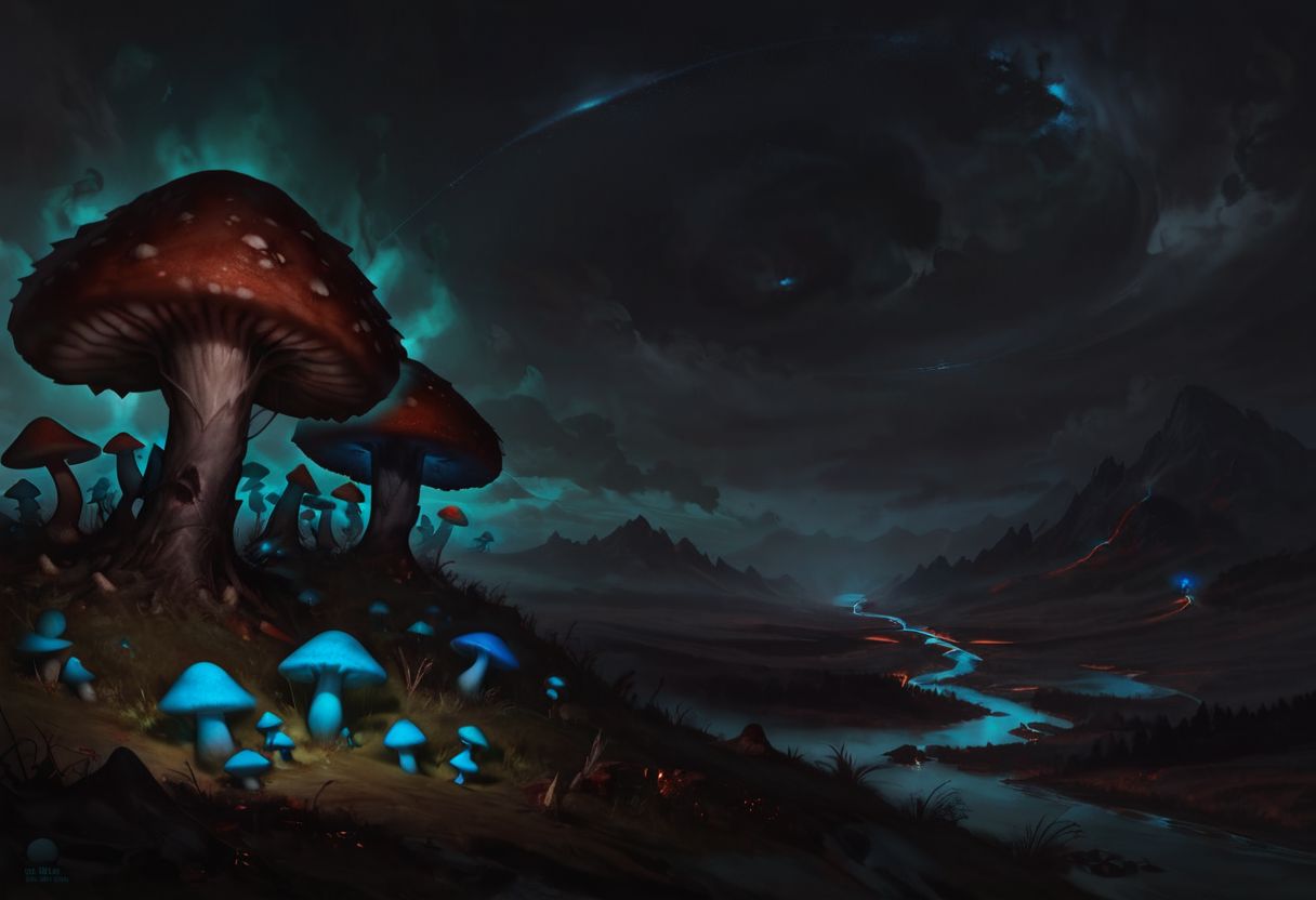 score_9, score_8_up, score_7_up, concept art, realistic, absurd res, 4k, cinematic, dark theme, low light, at night, dark cloudy sky, landscape, huge river, moving water, motion blur, water glowing with blue algae, land with tall grass on either side, small stone arch bridge far away in the distance, large bioluminescent (colorful:1.5) glowing mushrooms lighting the landscape, (red mushrooms, blue mushrooms, green mushrooms, orange mushrooms, multi-colored mushrooms, full of mushrooms:1.5), canal and mushrooms are the main focus of the image, vibrant colors,