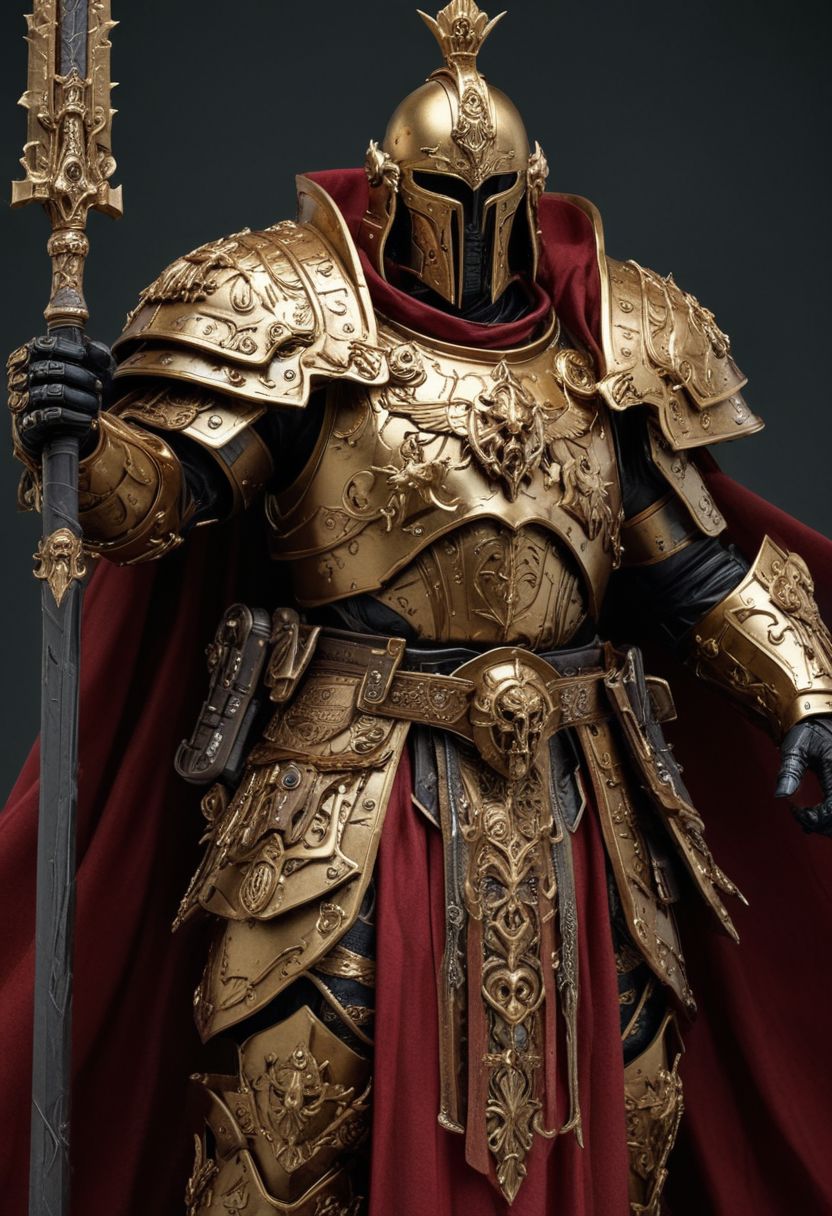 Adeptus Custodes warrior in Warhammer 40,000. They're imposing figures, clad in intricately crafted gold armor adorned with Imperium symbols. Their golden armor gleams with regal ornamentation, with a stoic yet fierce gaze behind their ornate helmet. They wield a Guardian Spear, crackling with energy, and wear a billowing cloak. Custodian Guards epitomize martial prowess and unwavering loyalty to the Emperor, serving as formidable protectors against chaos and heresy.