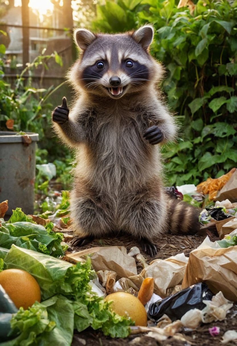 Closeup, thumb-up, a cute alien in the middle of a hoarder's front garden full of garbage aliens and food scraps, the raccoon in the middle of the garbage is happy and laughs into the camera, thumb up pose, very detailed, hd, RAW photograph, masterpiece, top quality, best quality, official art,highest detailed, atmospheric lighting, cinematic composition, complex multiple subjects, 4k HDR, vibrant, highly detailed, Leica Q2 with Summilux 35mm f/1.2 ASPH, Ultra High Resolution, wallpaper, 8K, Rich texture details, hyper detailed, detailed eyes, detailed background, dramatic angle, epic composition, high quality , (8k, RAW photo, highest quality), hyperrealistic,