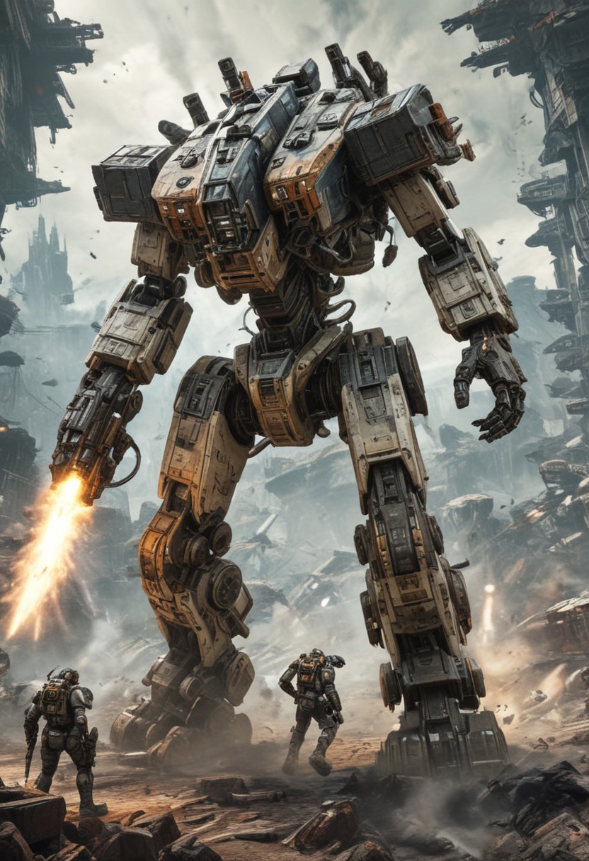 ((Best quality)), ((masterpiece)), ((realistic)), Imagine an epic and visually stunning scene from the world of Titanfall, where the battlefield is engulfed in a massive war. Towering Titans dominate the landscape, their imposing presence radiating power and strength. These colossal mechas unleash devastating firepower, their movements synchronized with the skillful pilots who command them. Explosions and gunfire fill the air, creating a chaotic yet awe-inspiring atmosphere. The attention to detail in the Titans' design and the seamless integration between pilots and machines evoke a sense of realism and immersion. This masterpiece captures the essence of Titanfall, immersing viewers in a world where the clash of Titans shapes the destiny of the battlefield a heavy mech, hard surface, hawken, sci-fi, battlefield, explosion, stray bullet, <lora:srd_v3_5d:0.8>