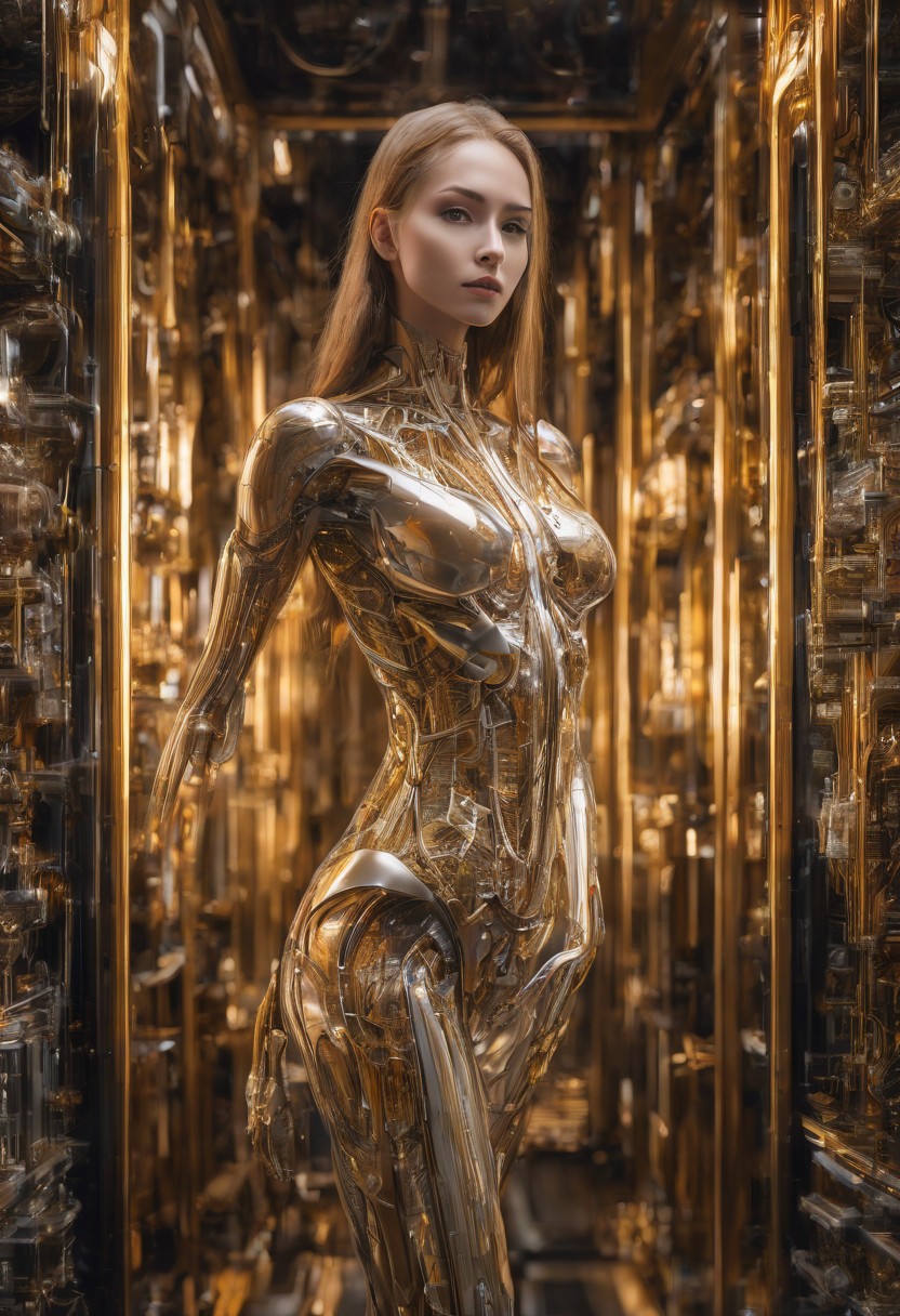 masterpiece, best quality, (1girl) standing, illustration, front view, 22 years old, beautiful, long hair, erotic, slender fit-muscled body, thin waist, long legs, tall height, ((small breasts:1.2)), tight bodysuit, very detailed face, perfect eyes, blue eyes, perfect lips, front towards viewer, direct gaze, the future, visible bone structure, schematic drawing, hybrid, android features, cyborg features, biomechanical, warm glow of vacuum tubes, transparent, cutaway view, golden light, schematic diagrams