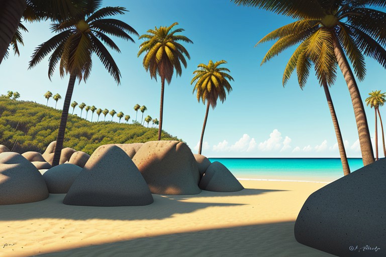 outside, daytime, noon, no people, beach, semi-realistic, yellow colors, rocky outcropping, palm tree