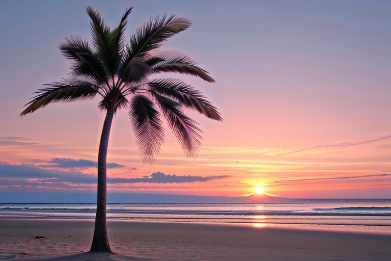 outside, daytime, sunrise, no people, beach, semi-realistic, pink colors, rocky outcropping, palm tree, Blackbird landed on the beach,