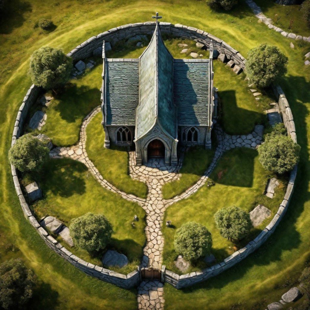 rpg tabletop combat map, role playing game map from above, of a highly detailed Celtic chapel inside with many connected rooms on a grass hilltop furniture, cozy, hyper realistic oil painting, combat map, high quality oil painting