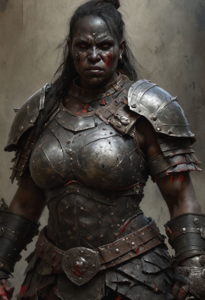 Berserker female orc Gladiator, black skin texture surface, masterpiece painted in the style of Anders Zorn | Marco Mazzoni | Yuri Ivanovich, oil on canvas