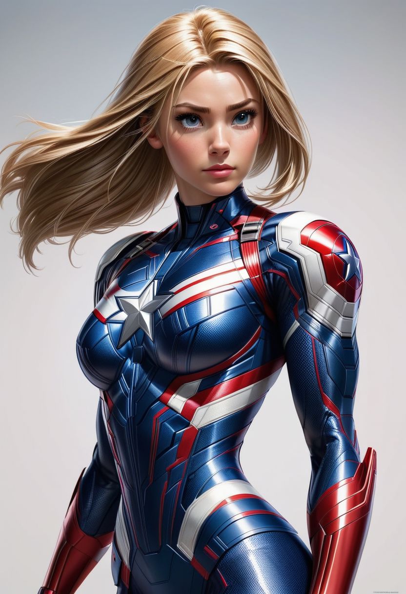 Rapunzel, Captain America, Captain America from the Marvel Comics, wearing a red, white, and blue suit, wielding a vibranium shield, standing tall in a heroic posepowered futuristic outfit, red and blue suit, ponytail, holding captain america round shield, swept bangs, style of stanley artgerm, white background, simple background