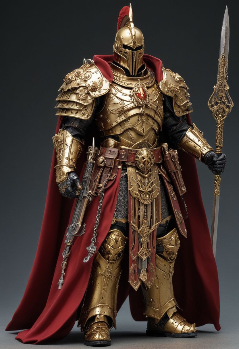 Adeptus Custodes warrior in Warhammer 40,000. They're imposing figures, clad in intricately crafted gold armor adorned with Imperium symbols. Their golden armor gleams with regal ornamentation, with a stoic yet fierce gaze behind their ornate helmet. They wield a Guardian Spear, crackling with energy, and wear a billowing cloak. Custodian Guards epitomize martial prowess and unwavering loyalty to the Emperor, serving as formidable protectors against chaos and heresy.