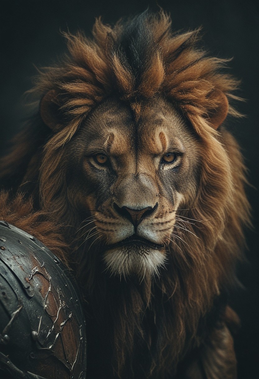 a mad lion beast in a barbarian armour, studio background, high-contrast palette, subtle grain, cinematic quality, modern art photograph