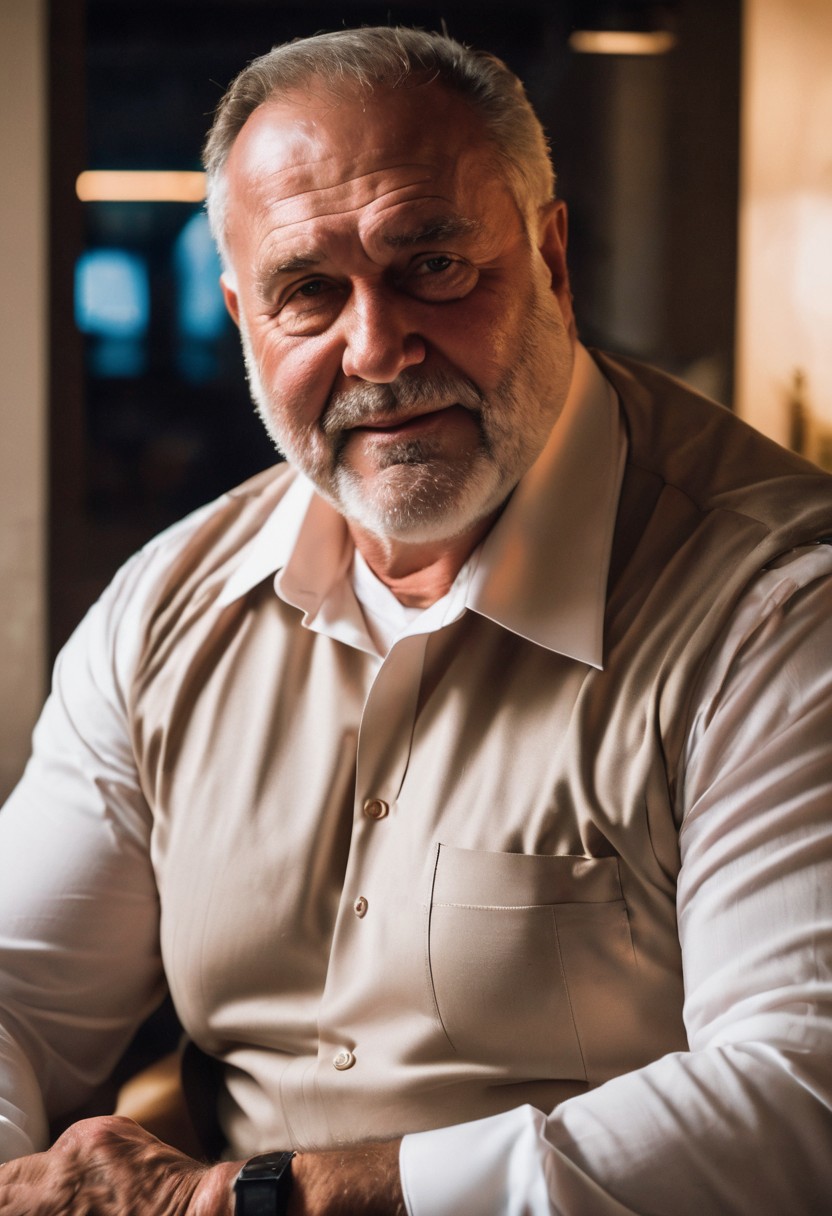 romantic flirty expression, intimate, cinematic hazey atmosphere, photograph, romantic movie scene, old mature man, old musclechub daddy, tanned skin, sweaty skin, sweating, oily skin, doublechin, handsome chubby old face, gentle smile, white latex undershirt muslceshirt tanktop, in a dark office at night, nighttime, dim, adventurer, archeologist, brute, wise, barbarian, berserker, leader, boss, ((flexing his massive biceps, tanned old bodybuilder))