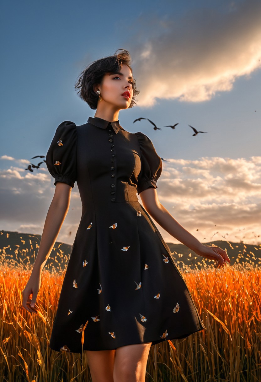 masterpiece, high resolution, gray hairs, looking ahead, from below, absurdres, 8k, high detail, intricate, best quality, orange grass, sunset, young woman, looking at viewer, short hair, black hair, dress, brown eyes, flower, short sleeves, outdoors, parted lips, sky, puffy sleeves, cloud, black dress, puffy short sleeves, lips, buttons, bird, wind, backlighting, realistic, field, crow, flock, photorealistic, hyperrealistic art, extremely high-resolution details, photographic, realism pushed to extreme, fine texture, incredibly lifelike, hard light