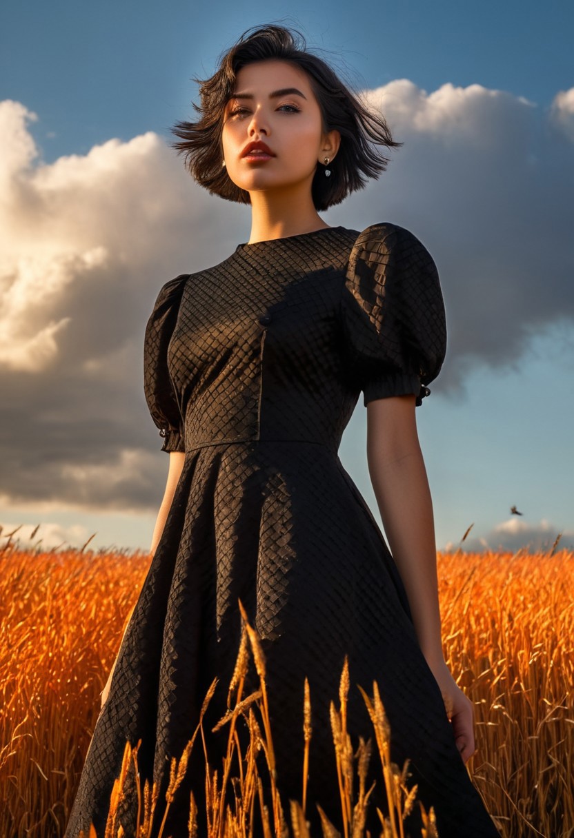 masterpiece, high resolution, gray hairs, looking ahead, from below, absurdres, 8k, high detail, intricate, best quality, orange grass, sunset, young woman, looking at viewer, short hair, black hair, dress, brown eyes, flower, short sleeves, outdoors, parted lips, sky, puffy sleeves, cloud, black dress, puffy short sleeves, lips, buttons, bird, wind, backlighting, realistic, field, crow, flock, photorealistic, hyperrealistic art, extremely high-resolution details, photographic, realism pushed to extreme, fine texture, incredibly lifelike, hard light