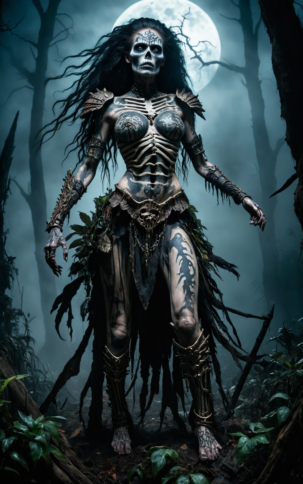 Hyperrealistic, horror theme, rotting undead Amazoness warrior with skeletal makeup, very tall and muscular, tribal tattoo, decaying beauty, high detail, dynamic composition, intricate textures, fierce expression, in action pose, dark surrounding, low light, nighttime setting, realistic shadows, ethereal, flowing hair, strong and decayed, wearing skeletal armor, jungle background, confident and menacing, ultra-quality, expressive eyes, detailed skeletal makeup, thick fog, light particles shining from the moonlight, horror style, eerie atmosphere, jumpscare element, ghostly apparitions, rotting flesh, menacing