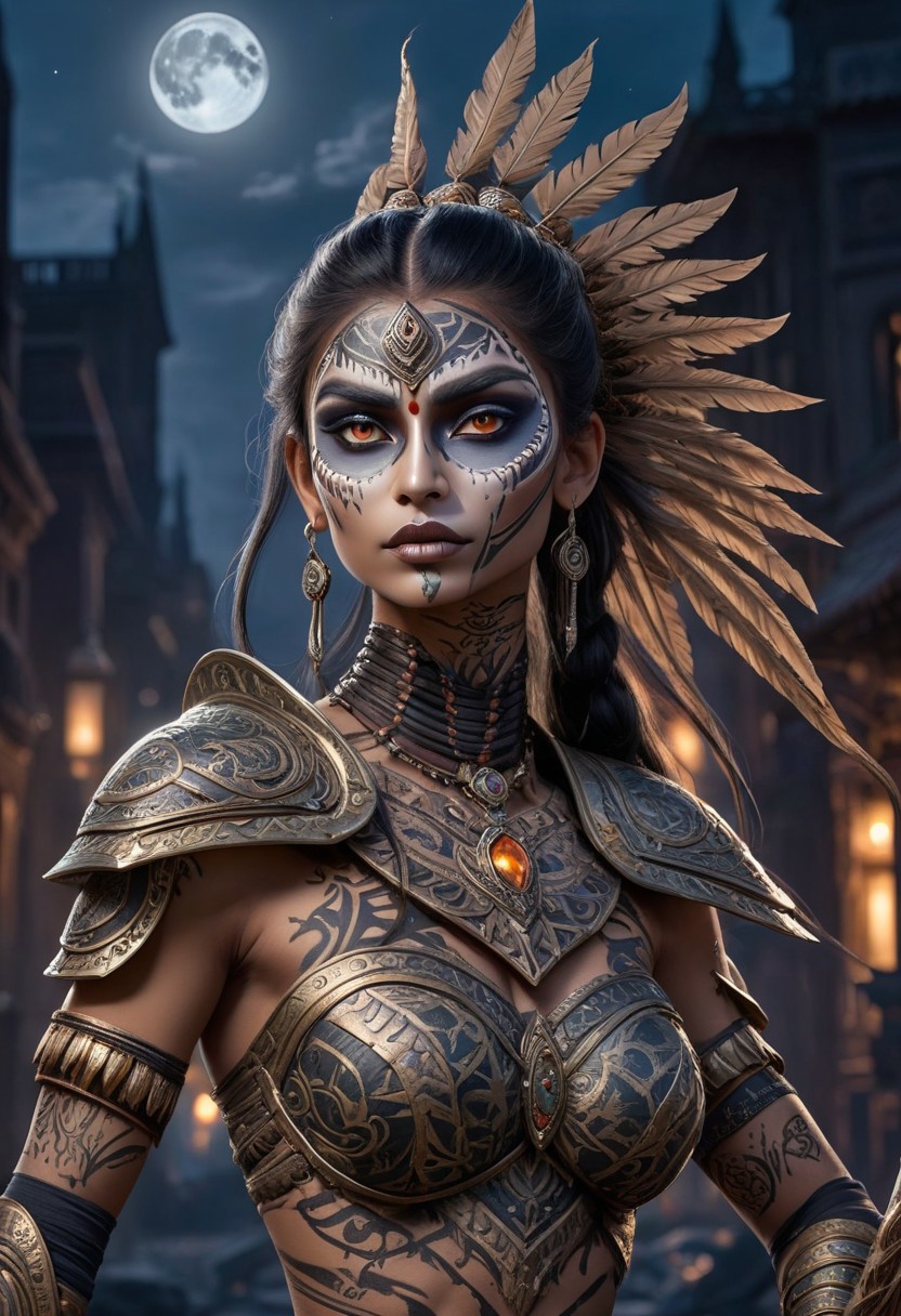 3D anime-style, Amazoness warrior with indian makeup, very tall and muscular, tribal tattoo, stunning beauty, high detail, dynamic composition, intricate textures, regal pose, dark surrounding, low light, nighttime setting, realistic shadows, ethereal, strong and graceful, wearing skeletal armor, city background, confident and majestic, ultra-quality, expressive eyes, detailed skeletal makeup, moonlight, thick fog, light particles shining from the moonlight
