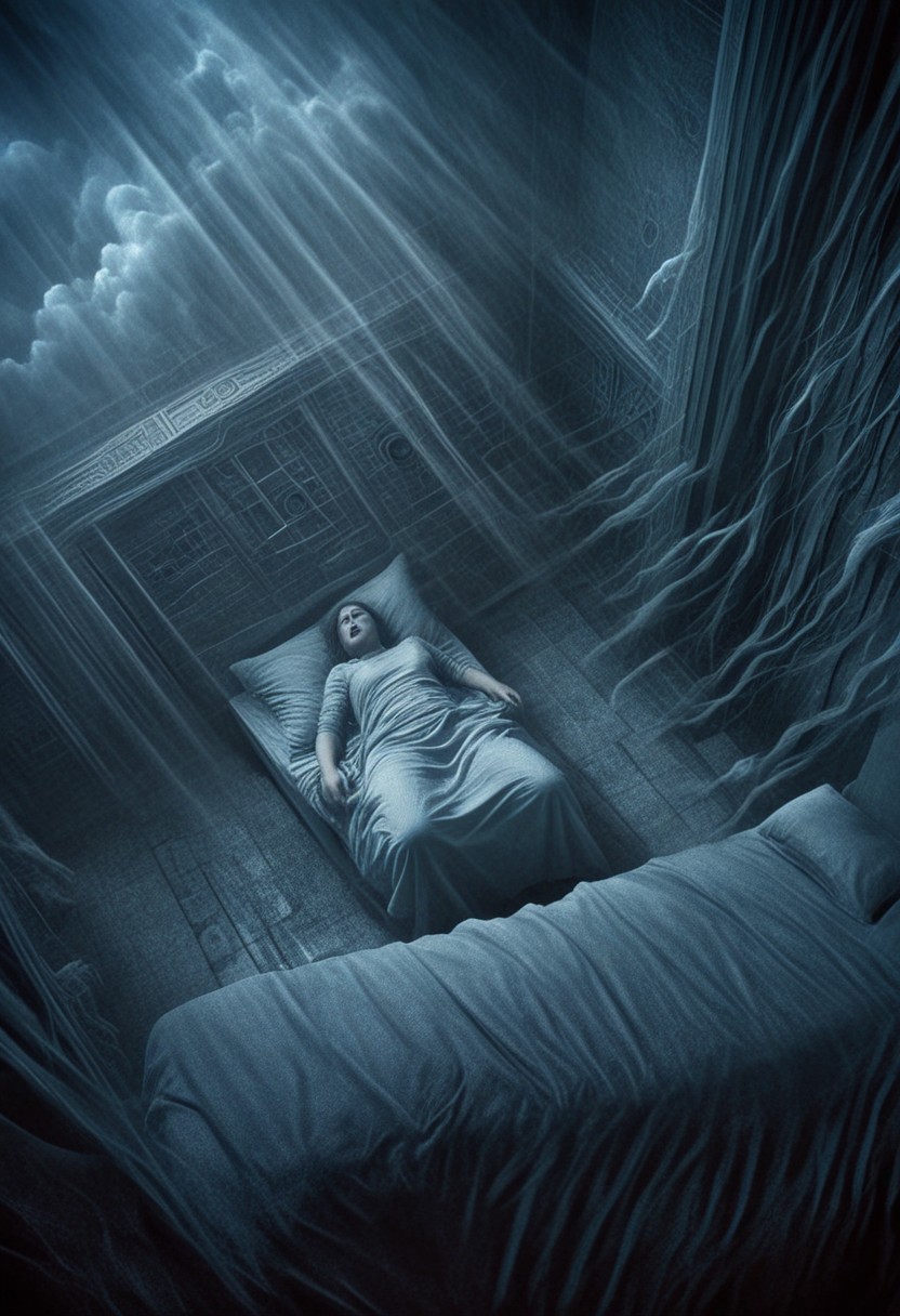 bedroom of a 30yo, sleeping, having nightmares, her bad dream manifests above her and nightmares of monsters are hovering about the woman, horror,, ((high angle photograph, highly dramatic cinematic atmosphere)), ((the very detailed background is imposing, with angular intimidating, artdeco style architectural designs)), cinematic spiritual horror, dynamic, , ((double exposures)), very detailed background, ominous ethereal background, epiCRealism, epiCNegative, Photographer Martin Kimbell Style, ral-dissolve