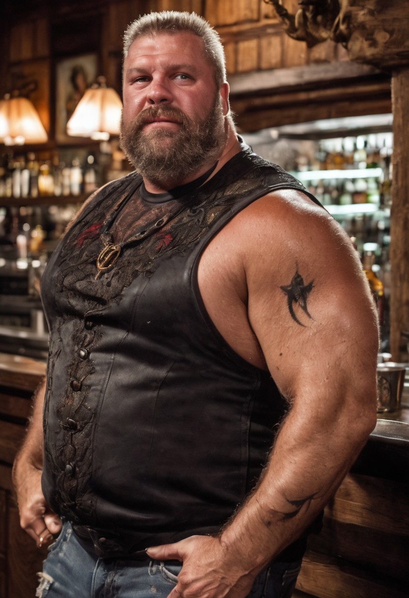 dark night, very dark, heavy metal music, alternative rock music, trucker, biker, daddybear, gay bear, ((romantic flirty expression, intimate, cinematic hazey atmosphere, arthouse movie, dark, nighttime, night, dark shadows, photograph, romantic movie scene)), old mature chubby obese german strongman man, old Bavarian musclechub daddy, tanned skin, sweaty skin, sweating, oily skin, short mohawk, punk, Punkrock, eccentric, extremely hairy, hairy chest, hairy arms, hairy shoulders, doublechin, fat arms, big arms, gigantic biceps, hairy armpits, huge belly, gigantic chest, handsome chubby old face, loving expression, flirty smirk, white undershirt muslceshirt tanktop, leather jeans, biker vest jeans jacket, colorful tattoos, golden jewellery, chunky golden rings, gold earring, in a dark puh. Bar at night, nighttime, dim, janitor, hobo, construction worker, trucker, brute, wise, barbarian, berserker, leader, ginger, ((flexing his massive biceps, tanned old german bodybuilder that likes heavy metal music, short mohawk haircut)), (((open welcoming arms, ready for a hug, hugging pose, punk, punkrocker))), ((masculine manly chubby face, extremely intimate sensual expression, loving expression)), (((sensual sexy pose, leaning against a wall in a bar pub at night, dark night)))