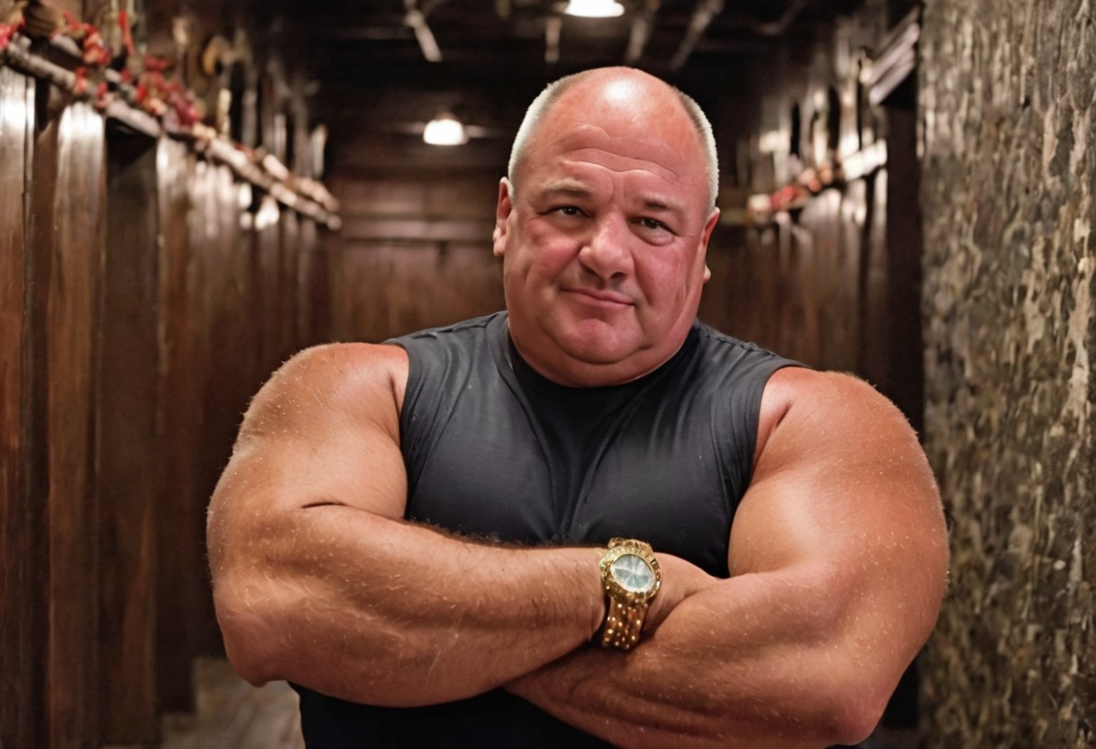 dark night, very dark, heavy metal music, alternative rock music, trucker, biker, daddybear, gay bear, ((romantic flirty expression, intimate, cinematic hazey atmosphere, arthouse movie, dark, nighttime, night, dark shadows, photograph, romantic movie scene)), mature chubby obese german strongman man, bavarian musclechub daddy, tanned skin, sweaty skin, sweating, oily skin, extremely hairy, hairy chest, hairy arms, hairy shoulders, doublechin, fat arms, big arms, gigantic biceps, hairy armpits, huge belly, gigantic chest, handsome chubby mature face, loving expression, flirty smirk, white undershirt muslceshirt tanktop, leather jeans, biker vest jeans jacket, colorful tattoos, golden jewellery, chunky golden rings, gold earring, in a dark puh. Bar at night, nighttime, dim, janitor, hobo, construction worker, trucker, brute, wise, barbarian, berserker, leader, boss, ((flexing his massive biceps, tanned mature german bodybuilder that likes heavy metal music)), (((open welcoming arms, ready for a hug, hugging pose))), ((masculine manly chubby face, extremely intimate sensual expression, loving expression)), (((sensual sexy pose, leaning against a wall in a bar pub at night, dark night)))