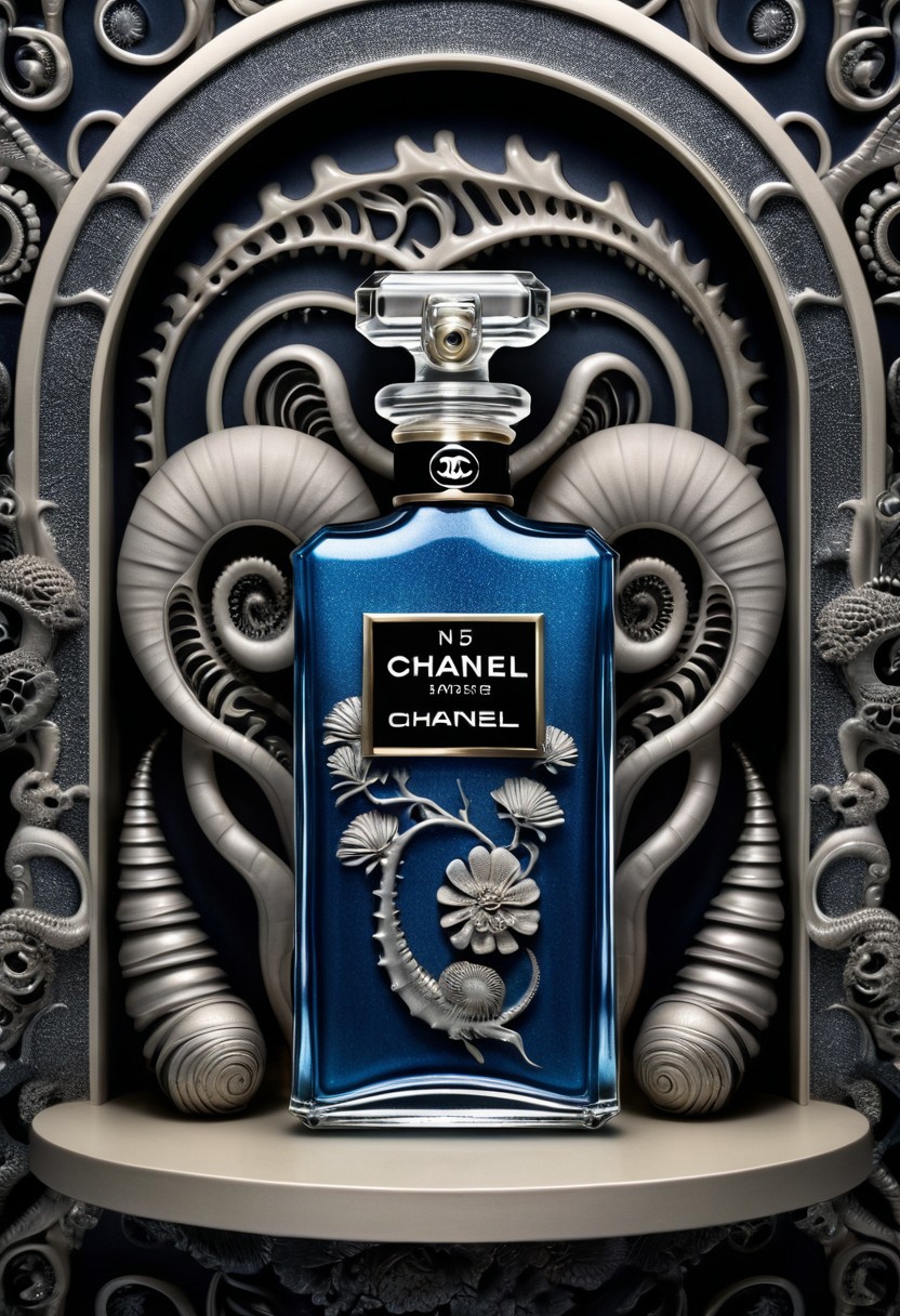 wallpaper pattern of Chanel no 5 perfume bottle, in the style of hokusai and HR Giger, best quality, masterpiece, HRGigerAI