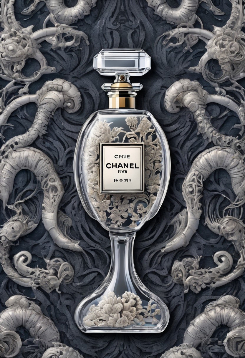 wallpaper pattern of Chanel no 5 perfume bottle, in the style of hokusai and HRGigerAI, best quality, masterpiece,