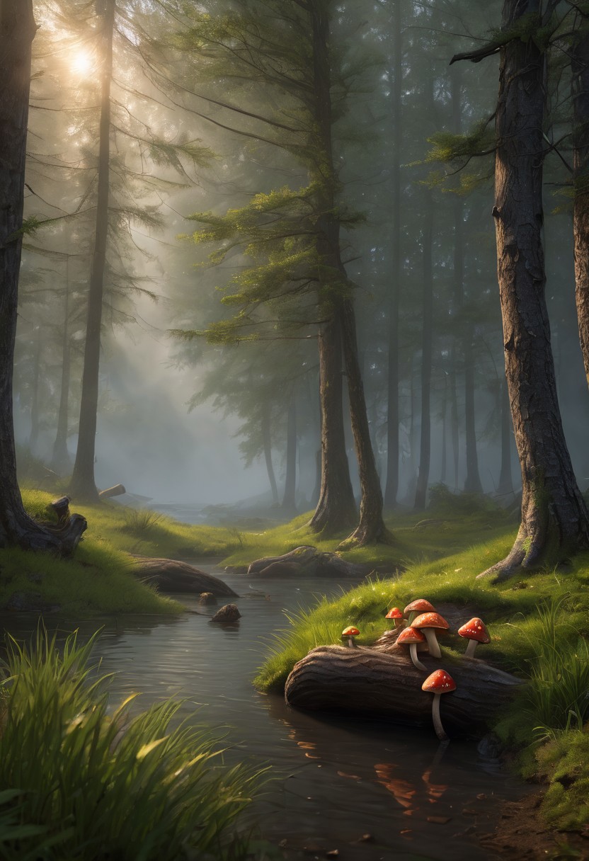 bokeh, 8k, breathtaking, lost in the deep woods, mushrooms, detailed tree bark, realistic, detailed mud, cloudy weather, morning lake mist, wet grass, sun rays, masterpiece, award-winning, professional, highly detailed, mist, style-nebmagic