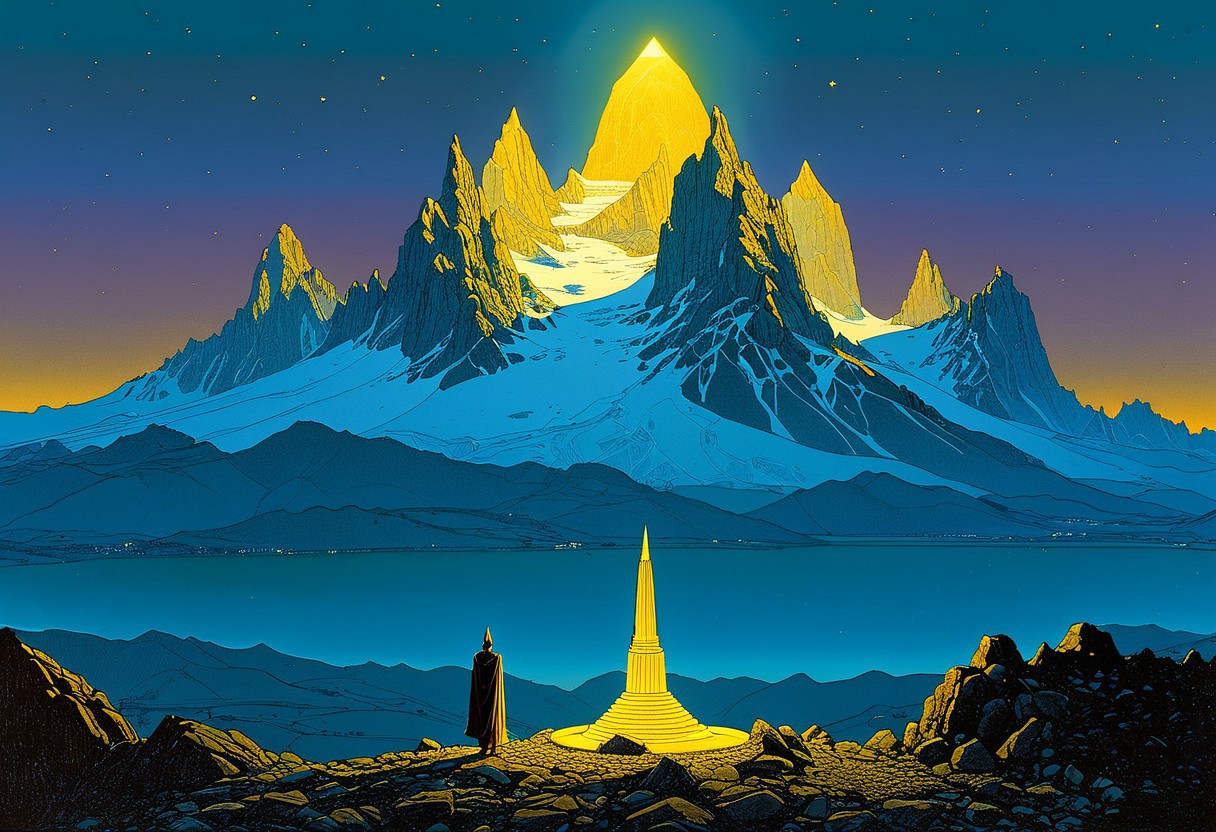 <lora:Moebius_Diffusion.safetensors:1.0>, A dramatic mountain range with jagged peaks and a distant ancient temple glowing with light, a figure standing near the peak, grey and glowing gold, the glowing temple peaks, in the style of Jean Giraud, in the style of Moebius,