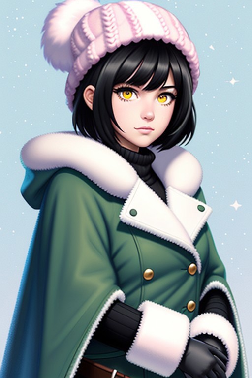 score_9, score_8_up, score_7_up, yellow eyes, black hair, very short hair, white eyelashes, peacoat, long coat, green coat, bow, pink fuzzy hat, fur-trimmed capelet, fur-trimmed coat, gloves, pastel blue background, full moon, stars, wind, emotionless, cowboy shot, facing viewer, d3p1x3l, pixel art, HZLZVZ