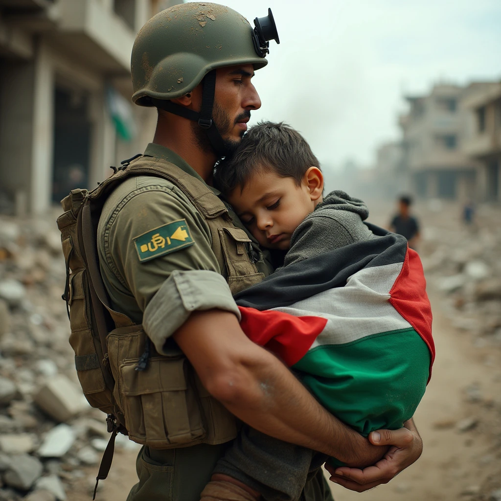 a high-quality journalistic-style photograph depicting a poignant scene. The image should show a young Arab child sleeping, wrapped in a Palestinian flag. The child is being carried by an IDF (Israel Defense Forces) soldier. Both the child and the soldier should appear visibly very dirty and covered in dust, reflecting the aftermath of a recent conflict. The background should feature the ruins of a destroyed building, with visible debris and smoke. The overall composition should capture the gravity and emotional impact of the situation
