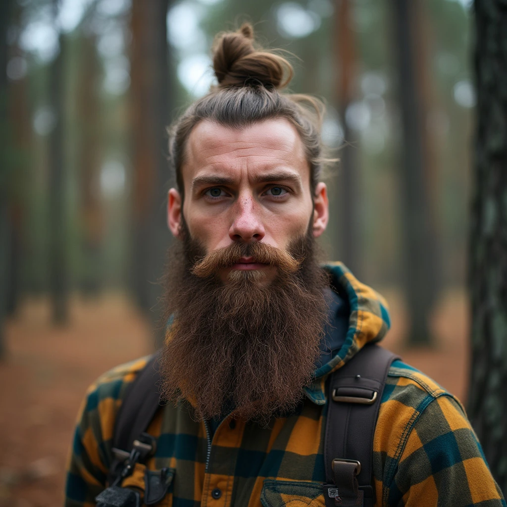 editorial photography, close-up portrait photo of a lumberjack with long beard and a man bun in the woods looking straight into the camera, digital photography, high quality, sharp focus, 8k, 4k