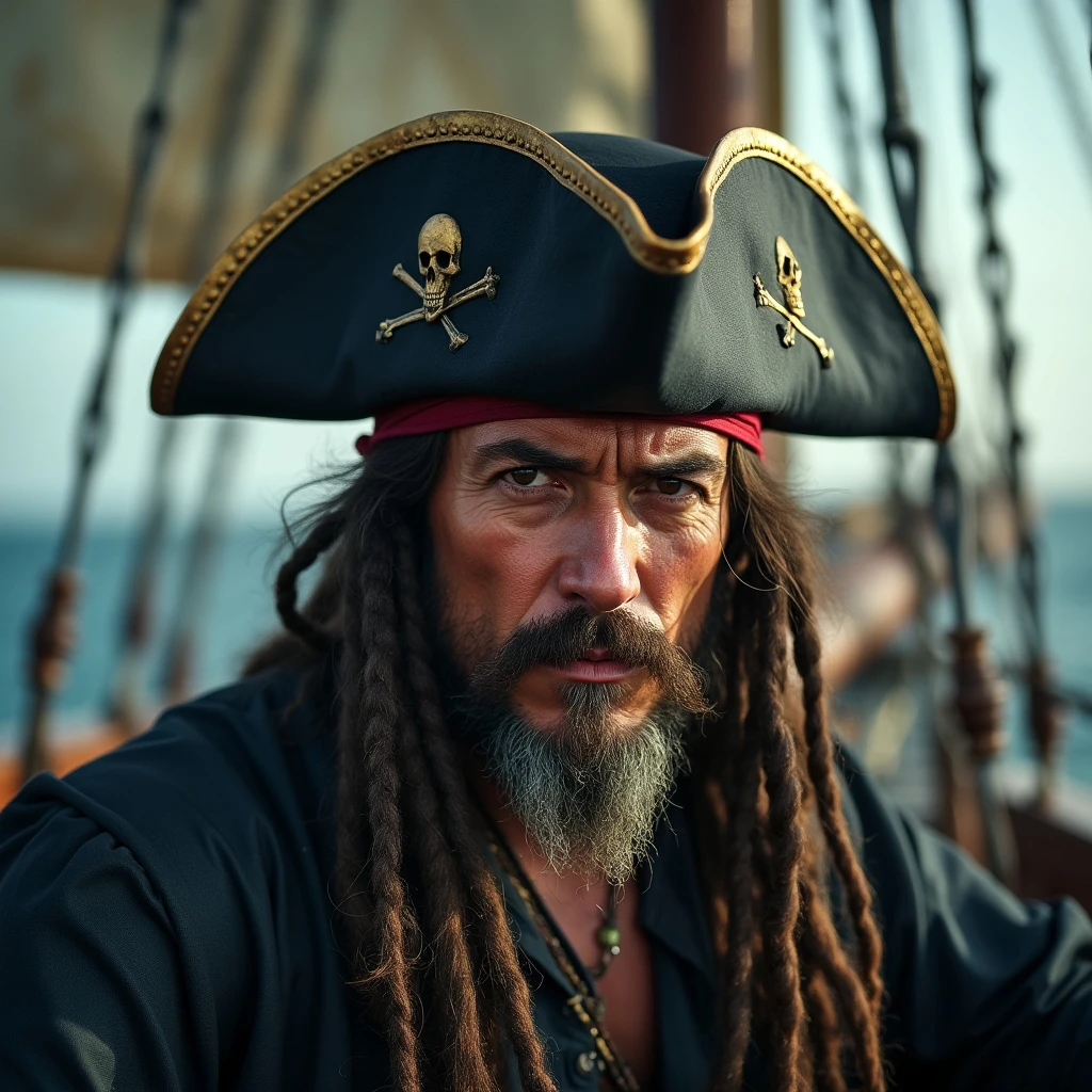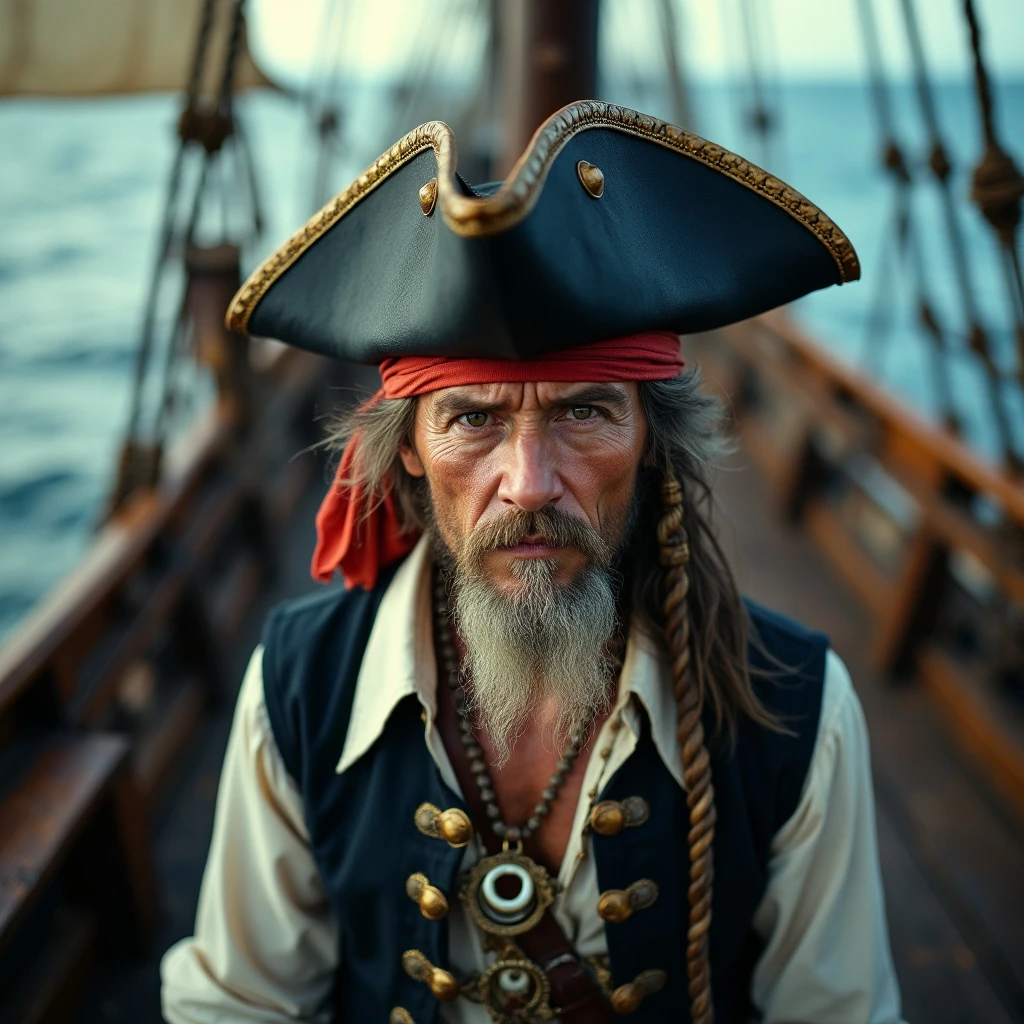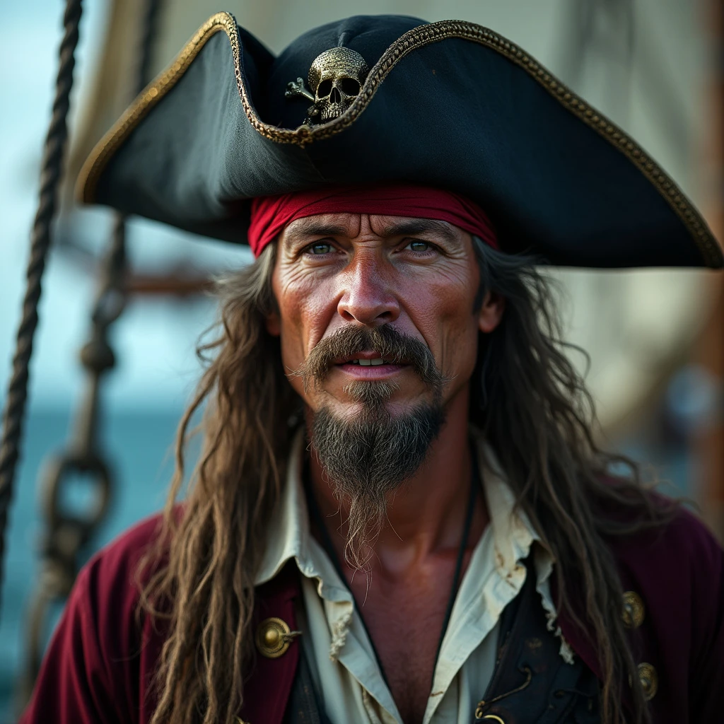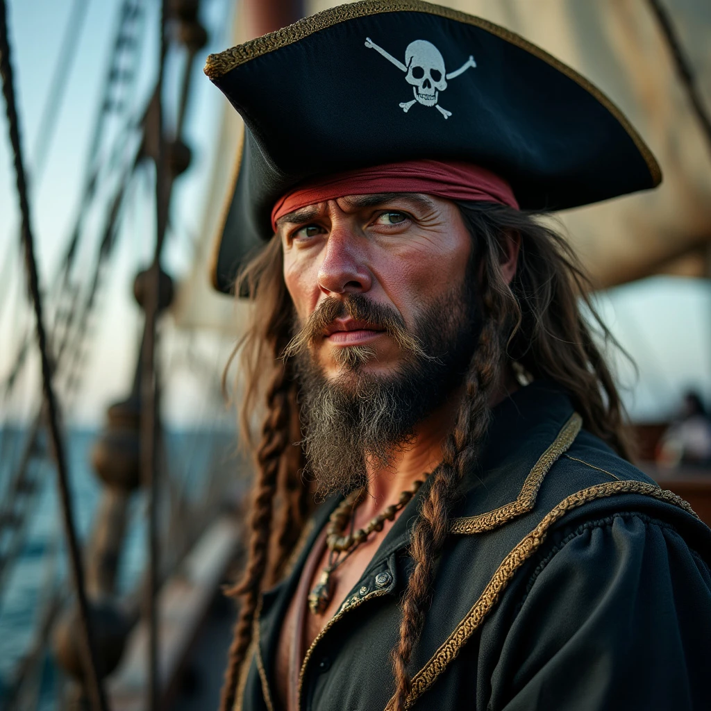 portrait photo of a pirate onboard a pirate ship, digital photography, high quality, sharp focus, 8k, 4k, movie still