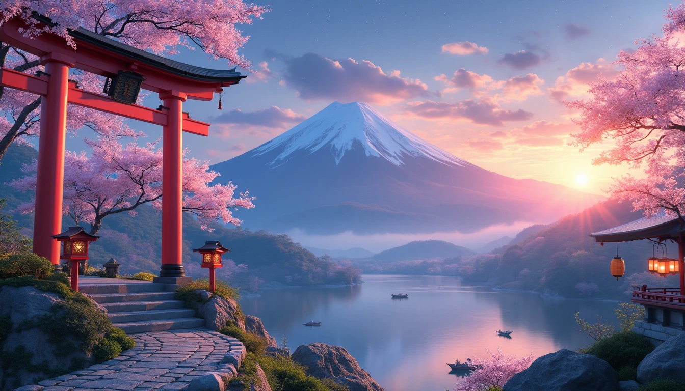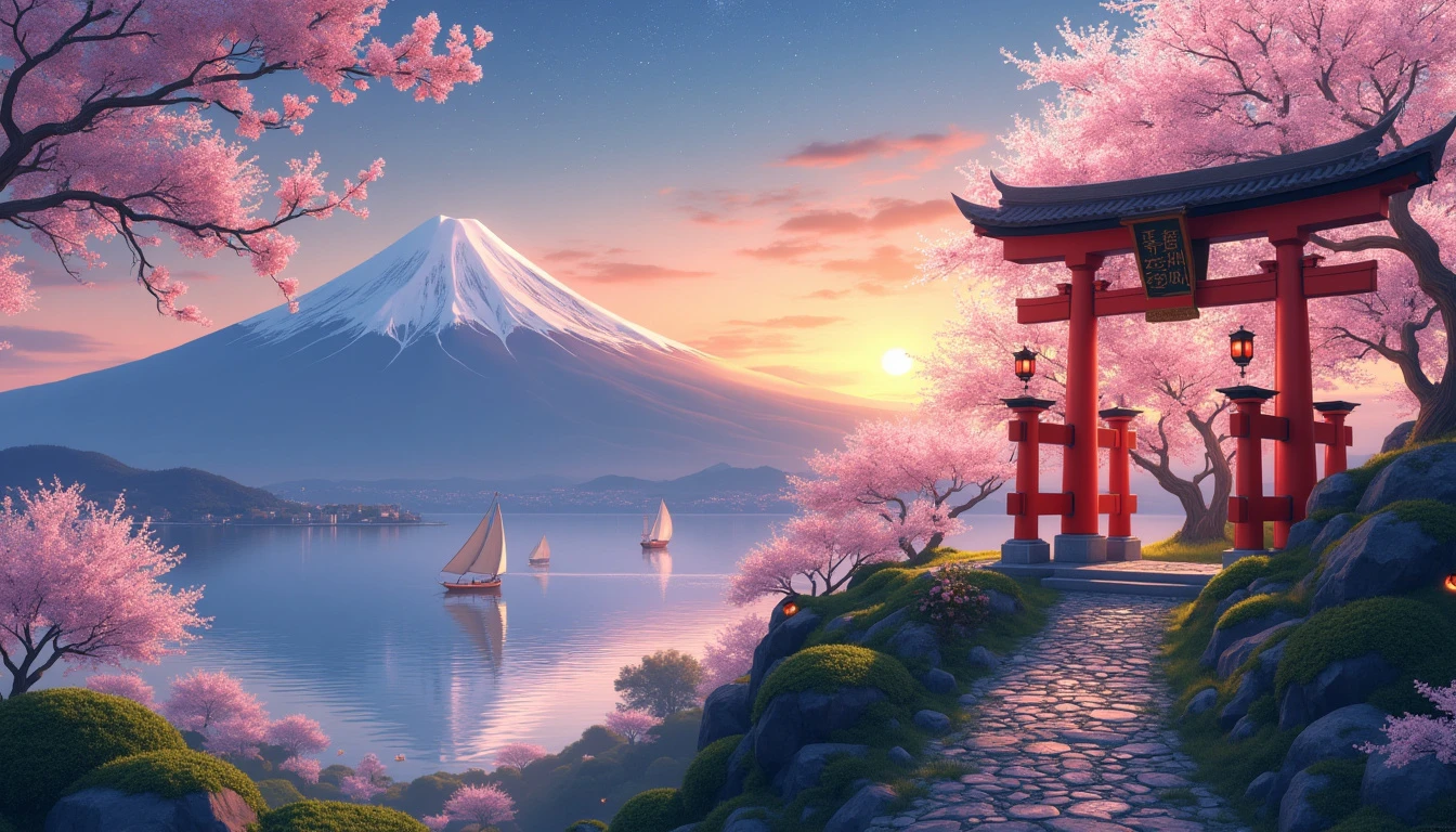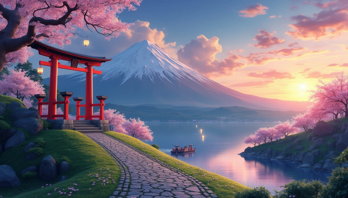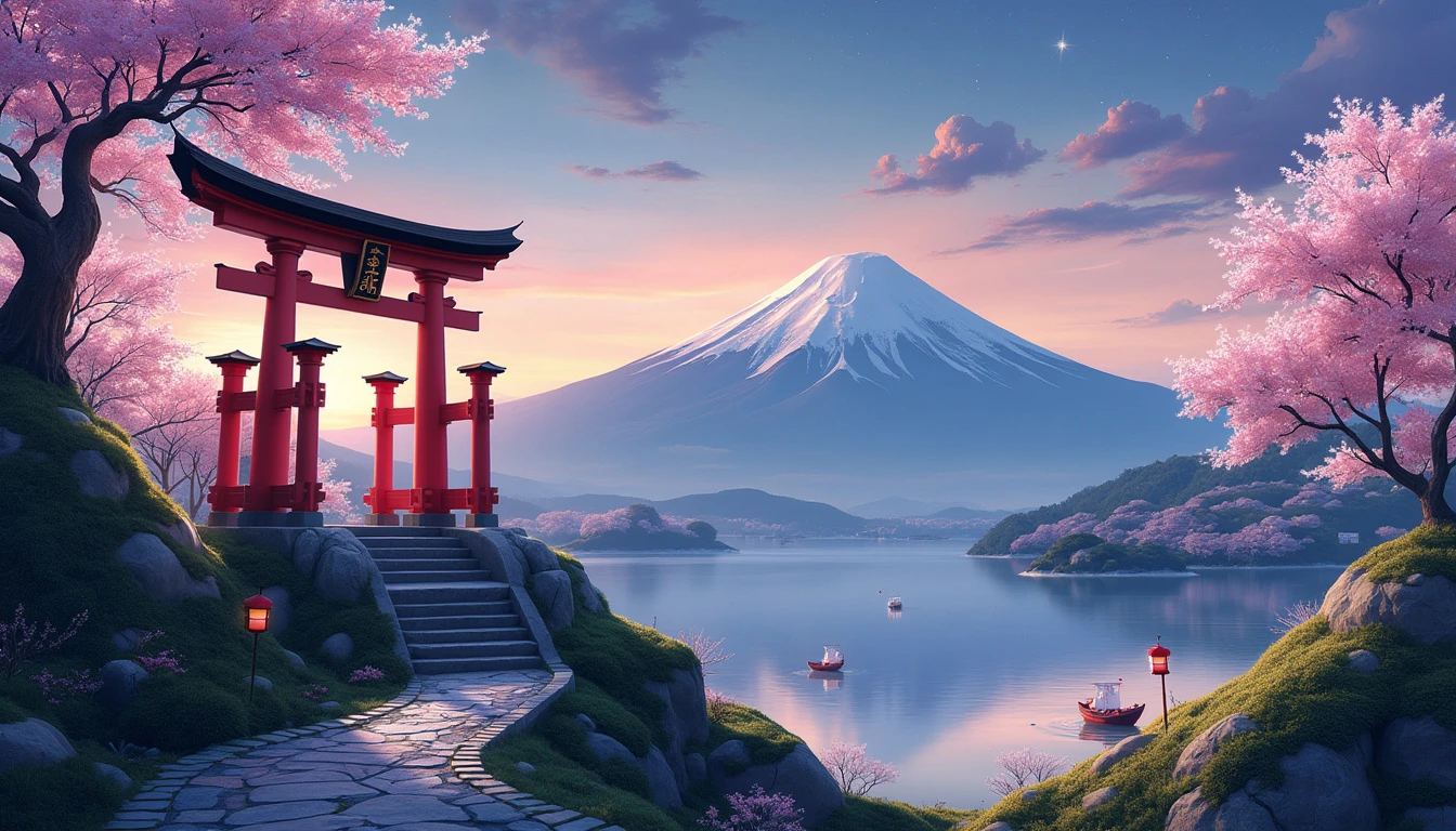 Extremely detailed digital image. In the bottom right corner of the foreground, a traditional Japanese shrine stands gracefully atop a verdant hill. The shrine is adorned with intricate wooden carvings and vibrant red accents, typical of Shinto architecture. A cobbled stone pathway, lined with delicate cherry blossom trees in full bloom, winds its way up the hill, leading to a striking torii gate that marks the entrance to the sacred shrine. The torii gate, painted in a vivid vermilion, stands tall and imposing, its curved top beams contrasting beautifully with the soft pink petals of the cherry blossoms. Lanterns hanging from the gate sway gently in the breeze, casting a warm, inviting glow as the sun begins to set. In the background, a majestic range of mountains dominates the horizon, their peaks shrouded in a soft mist. The mountains are painted in varying shades of blue and purple, creating a serene and mystical atmosphere. The sky above is a breathtaking gradient of colors, transitioning from the warm hues of sunset to the deep blues of twilight, with a few stars beginning to twinkle in the distance. Nestled at the base of the mountains, a tranquil lake mirrors the picturesque scene, its surface reflecting the vibrant colors of the sky and the delicate blossoms of the cherry trees. Small traditional Japanese boats with paper lanterns float serenely on the water, adding to the scene's peaceful ambiance.