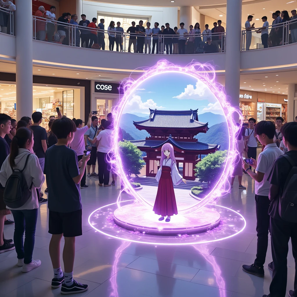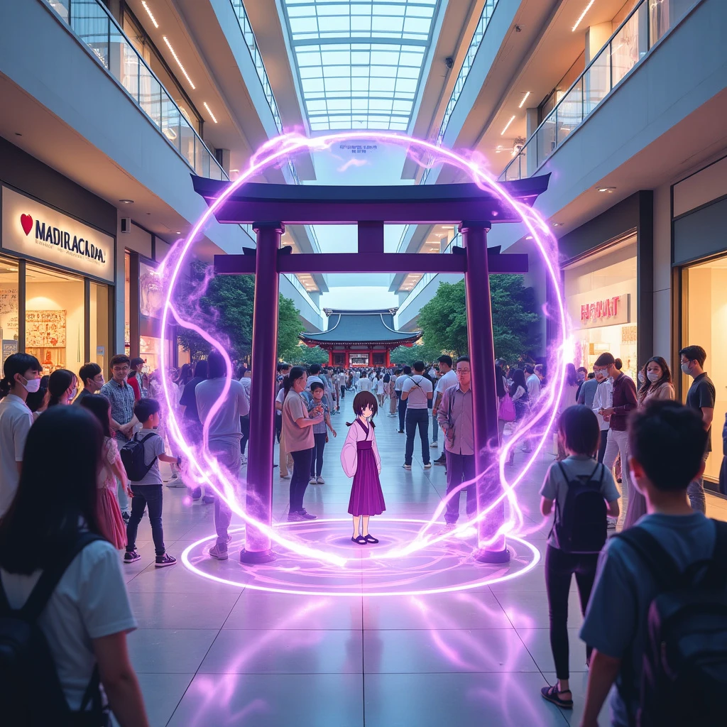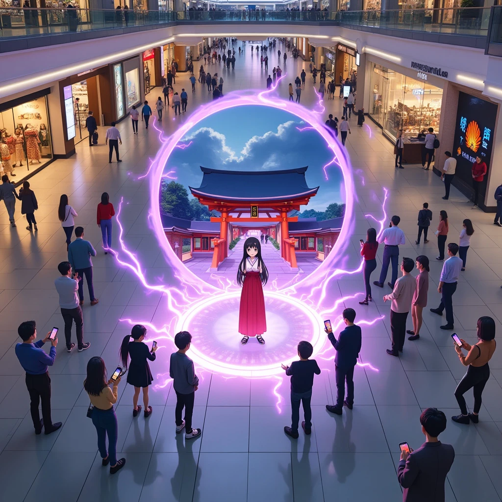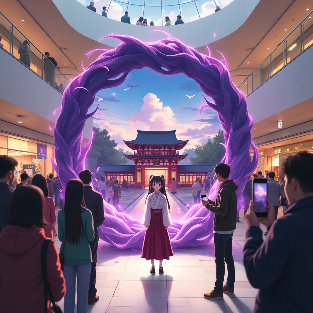 Photograph of a bustling shopping mall. In the center of the shopping mall is a magical circular portal surrounded by some flowing purple energy. Inside the portal is an alternate 2D anime dimension with a 2D anime cutout of a Japanese shrine edited into the photo. There is a single anime girl wearing a miko outfit inside the portal. People are gathered around the portal and curiously looking at it. Some people are taking pictures with their smartphone.