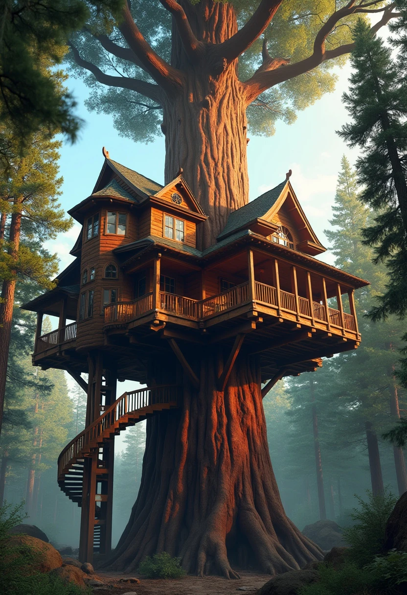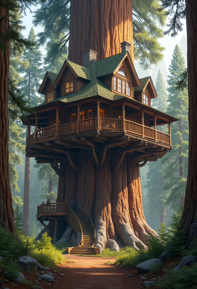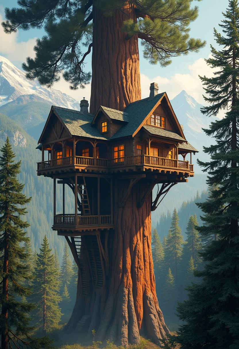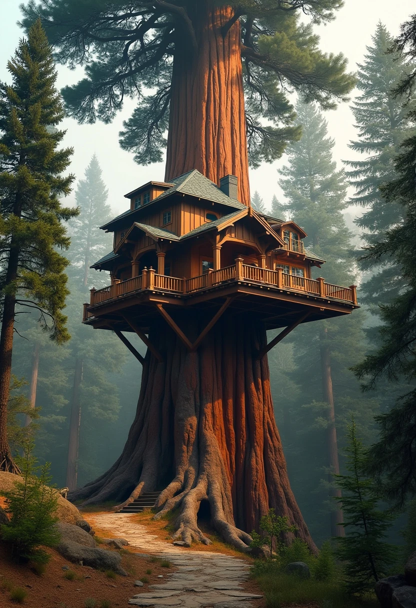 photo of a grand, mansion-like treehouse situated high up in the branches of a towering sequoia tree, near the canopy. The treehouse should be large and elaborate, resembling a stately home with multiple rooms. The image should be taken from a distance to showcase the impressive height of the sequoia and the grandeur of the treehouse. Include a rustic wooden elevator visibly attached to the tree, leading up to the treehouse. The sequoia's expansive canopy should frame the scene, highlighting the treehouse's elevated position and majestic appearance. digital photography.