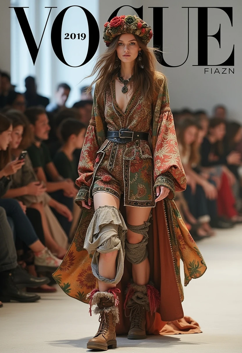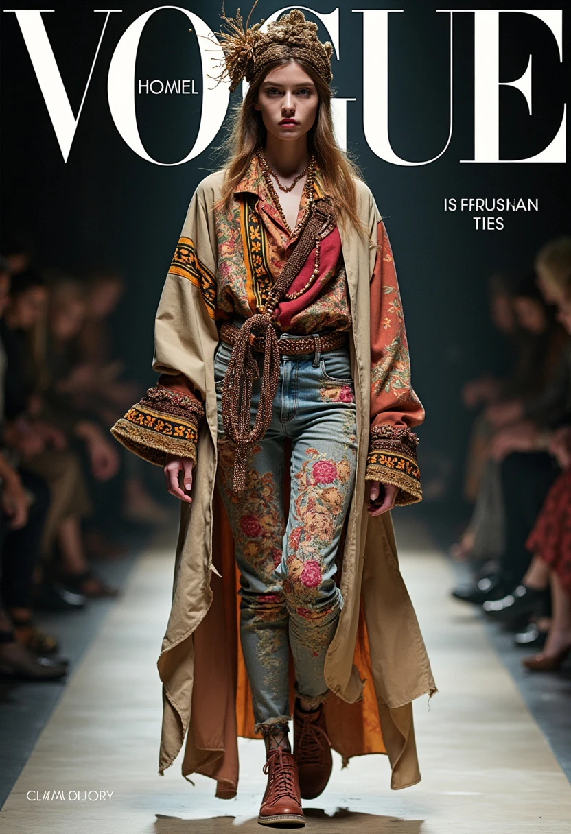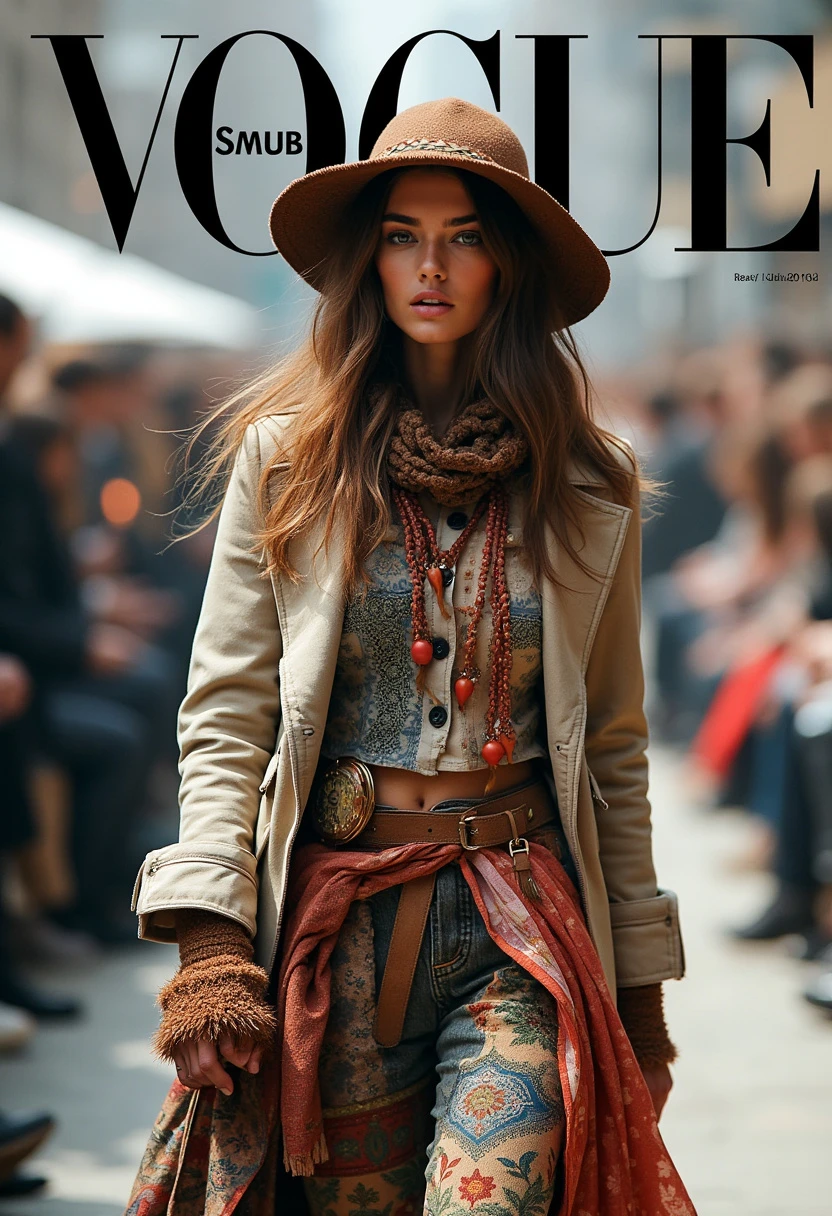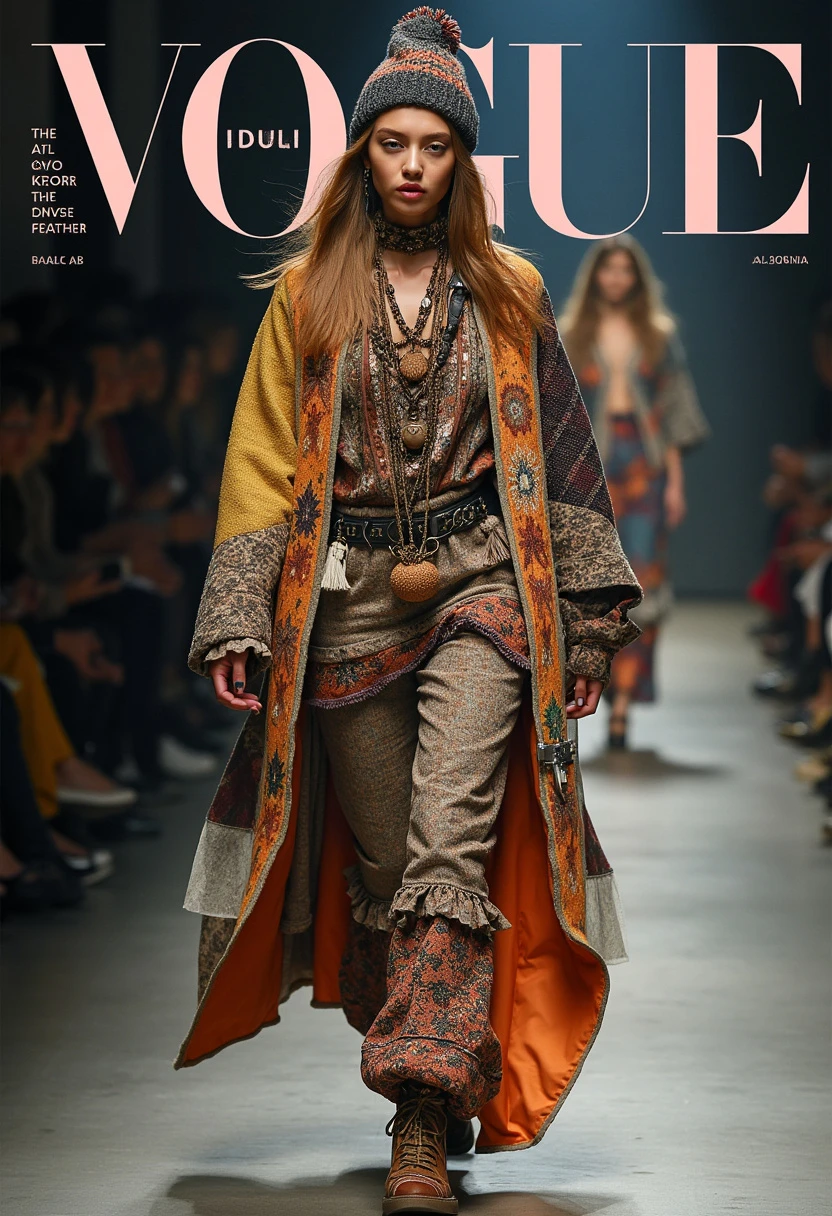 Create a Vogue magazine cover showcasing a new fashion trend. The cover features a model on the runway wearing a layered outfit with various fabrics and prints, reminiscent of a Russian babushka. The outfit should include a mix of accessories, combining a bohemian, hippie style with a disheveled, street-inspired look. The model should display a striking and eclectic appearance, blending elegance with an unconventional edge. Ensure that the magazine cover reflects Vogue's sophisticated and high-fashion style, with elegant typography and a polished layout, while highlighting the unique and creative fashion trend.