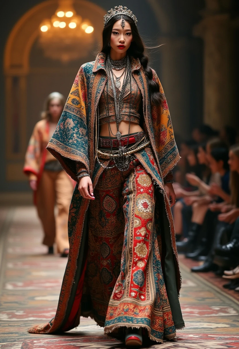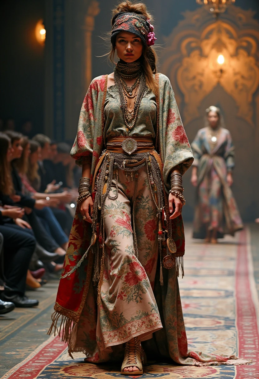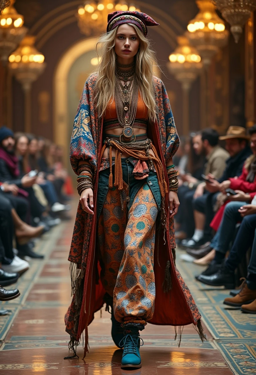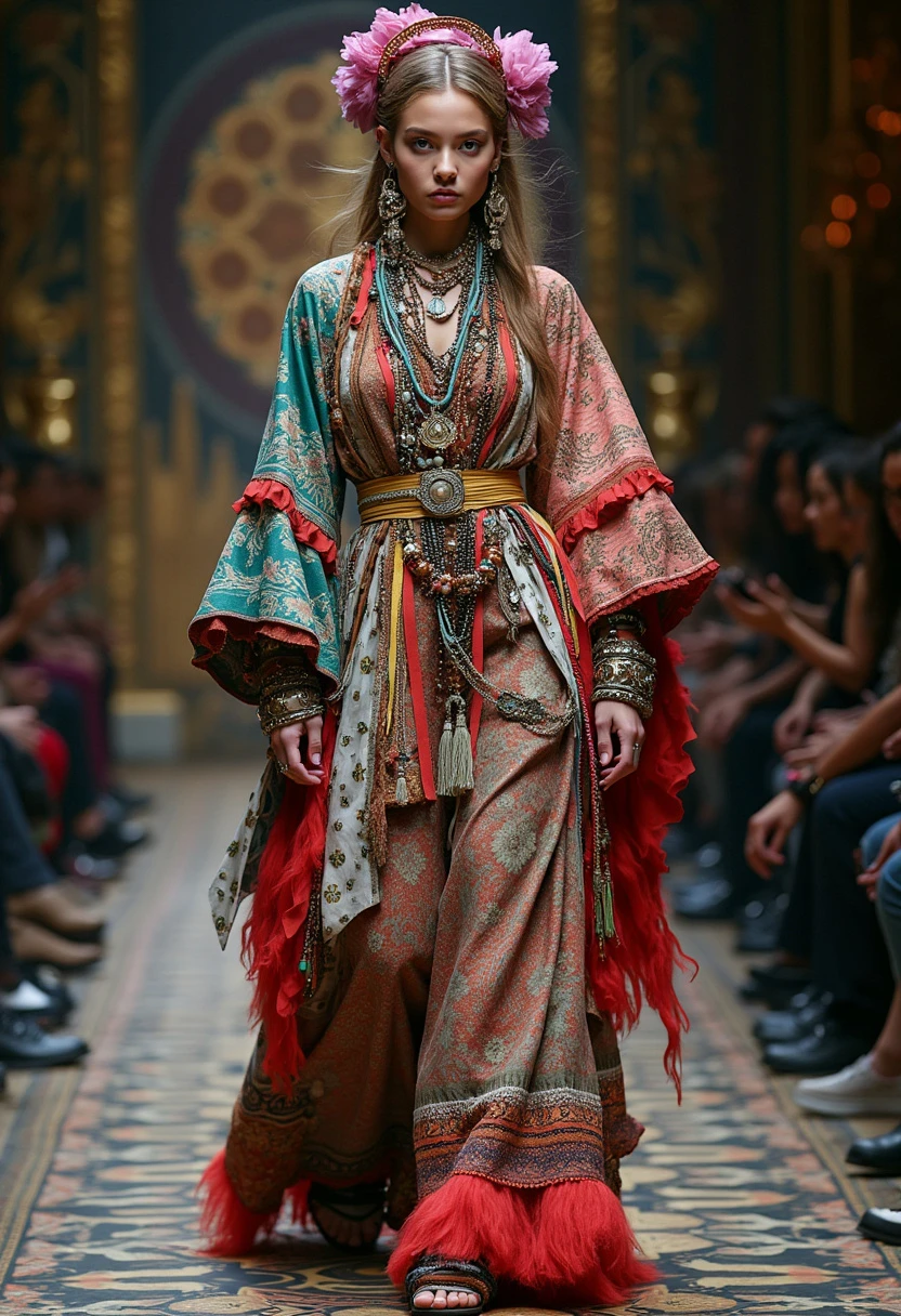 Create a high-fashion runway photo showcasing a model wearing a strikingly extravagant outfit. The model is dressed in multiple layers of fabrics with various prints, reminiscent of a Russian babushka. The outfit should include an excessive amount of accessories, blending bohemian and street-inspired elements. The fashion should be bold and over-the-top, with the model adorned in numerous necklaces, bracelets, and headpieces, along with an abundance of textures and colors. The runway setting should have dramatic lighting and an opulent backdrop to enhance the overall extravagant presentation of the fashion.
