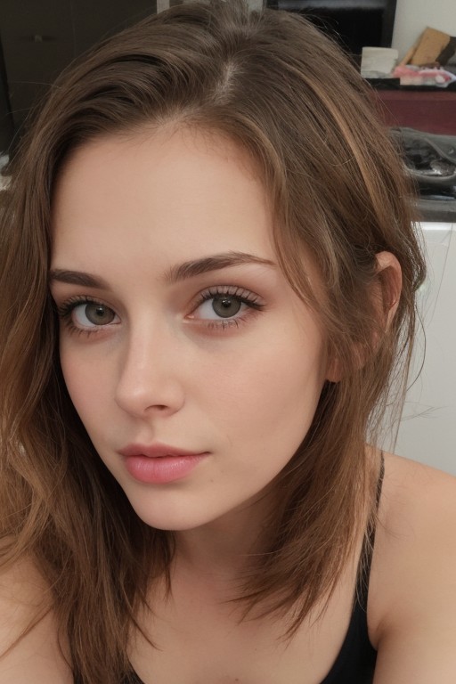 25 yo girl, brunette, close-up, girl next door, cute, innocent, looking at viewer, messy hair, waist up