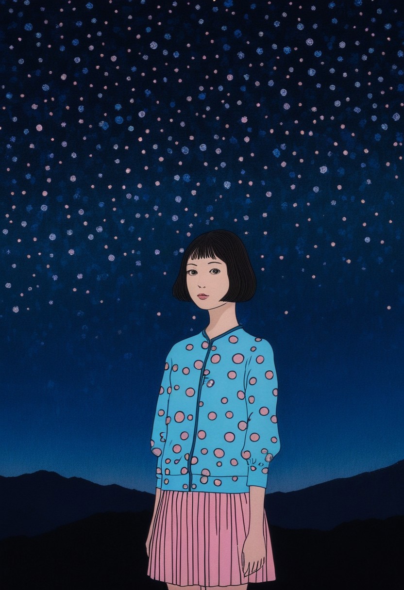 Thinking,abstract art, Tomie Kawakami, (style of Yuko Shimizu:1.3),pale blue and pale pink theme, dark sky,dark stars, thoughtful face, Full body