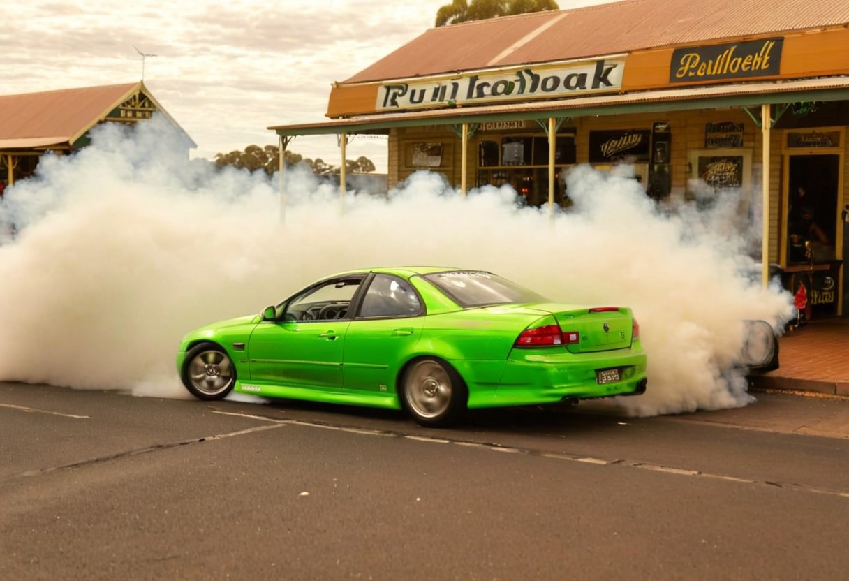 <lora:cars:0.8> aw0k car, holden commodore v8 ute, hooning, bright green paint, burnout, smoke from rear tyres, day time in outback, in front of pub <lora:sports car style:0.7> motion blur, background blur, speed, action shot