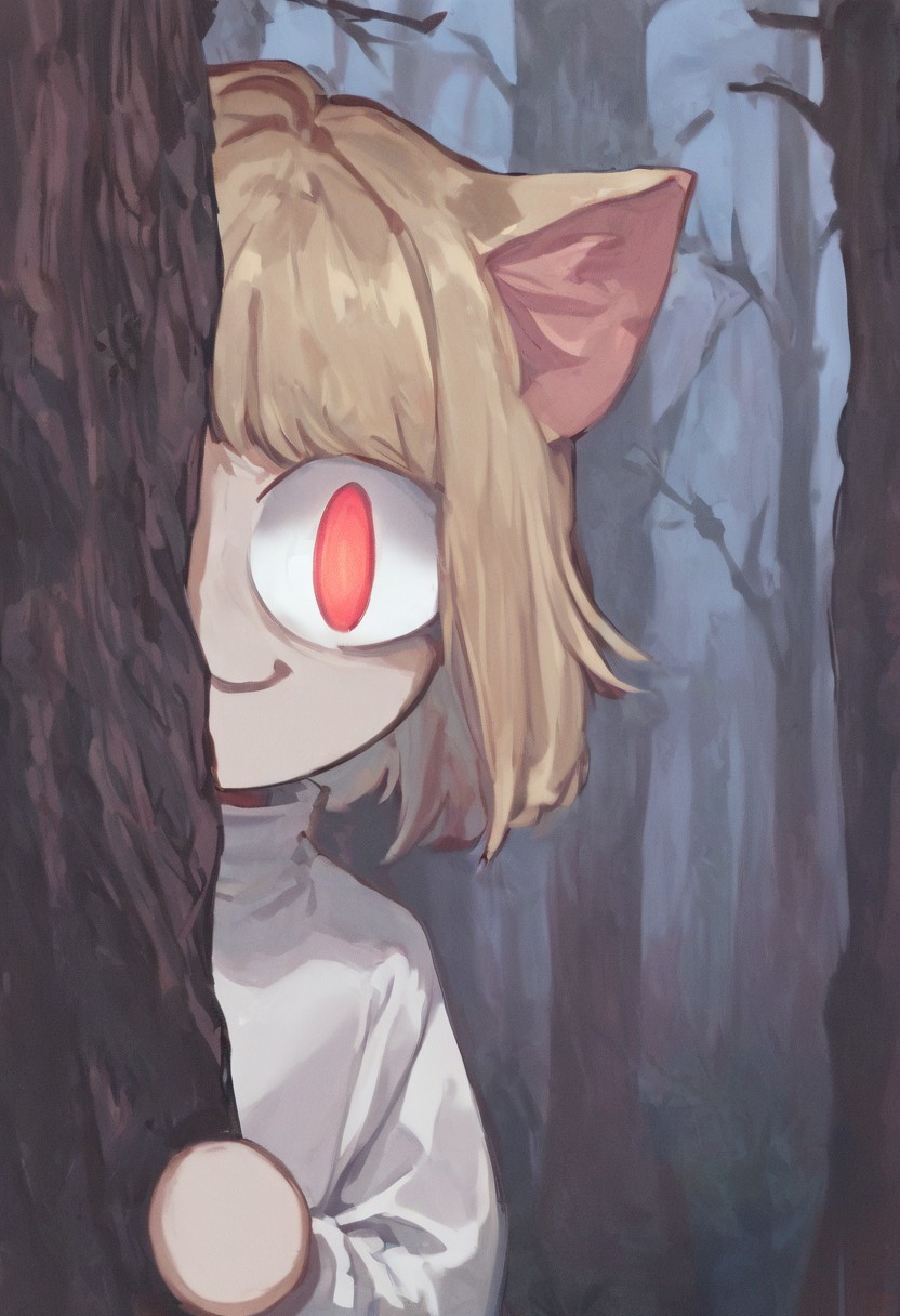 score_9, score_8_up, score_7_up, solo, peeking out, upper body, hiding behind tree, night, horror \(theme\), forest, necoarc, glowing eyes, cat ears, blonde hair, red eyes, chibi, :3, white shirt, turtleneck, looking at viewer