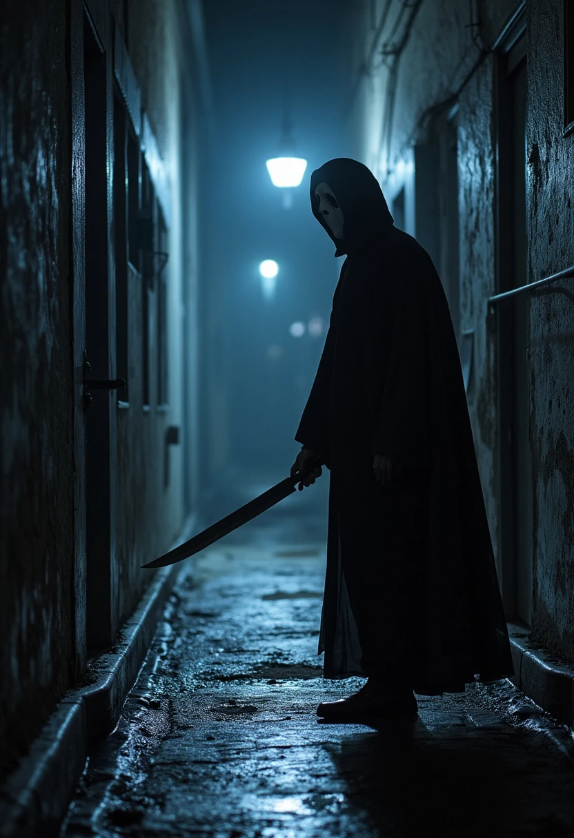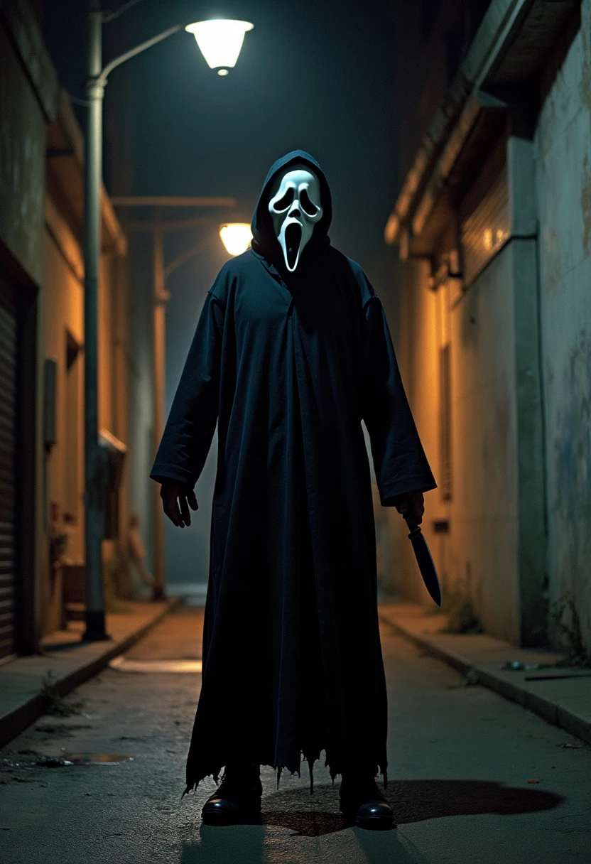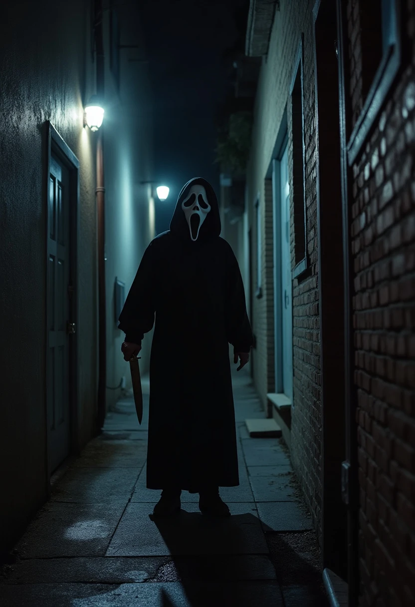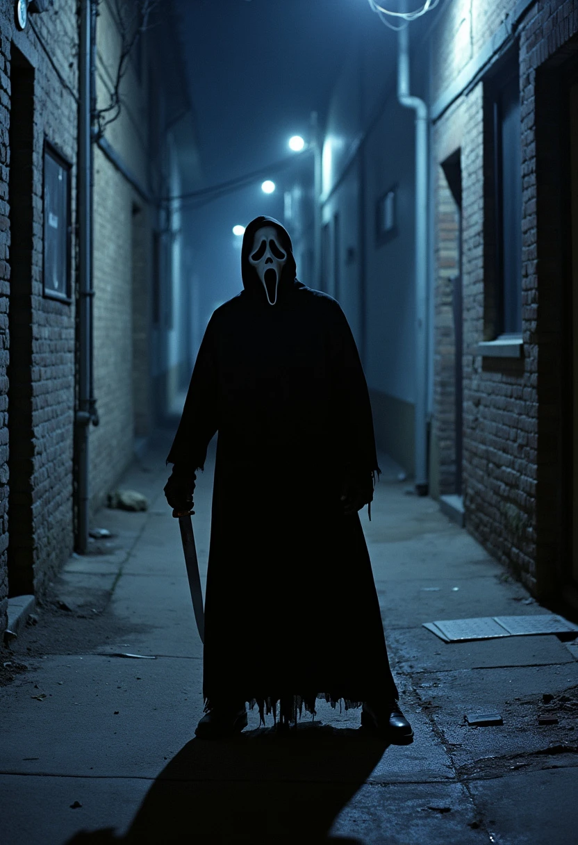 1996 Scream movie still, Ghost Face holding a knife in a dark alley at midnight, digital photography, high quality. no lights