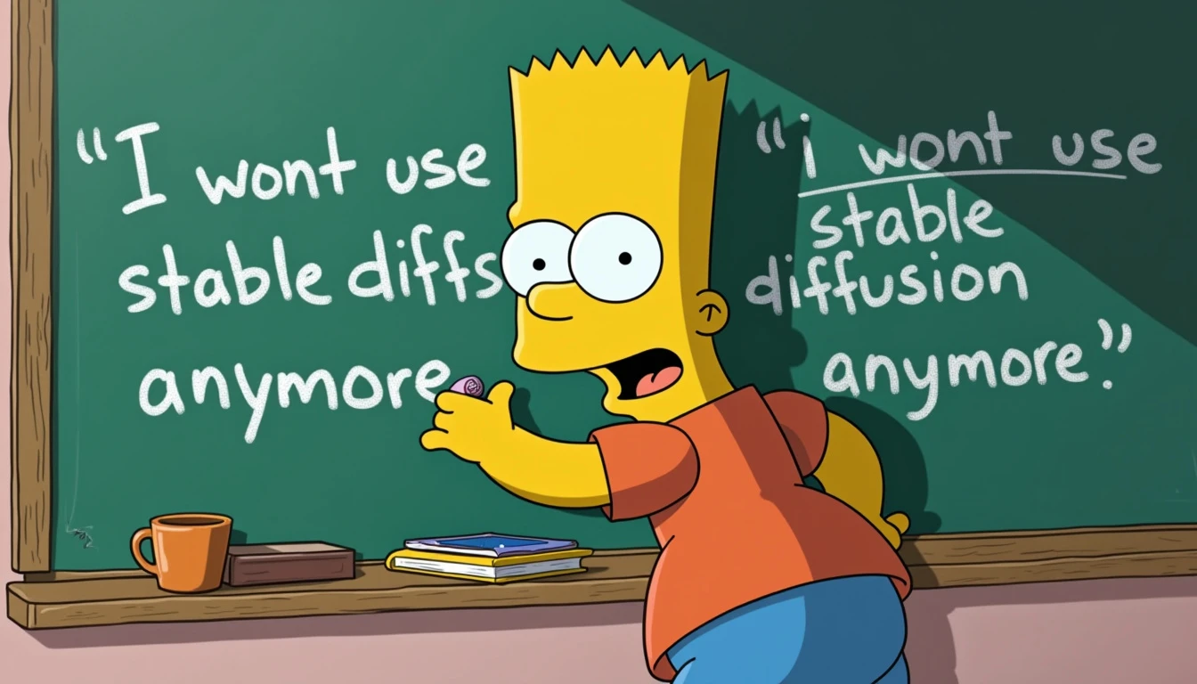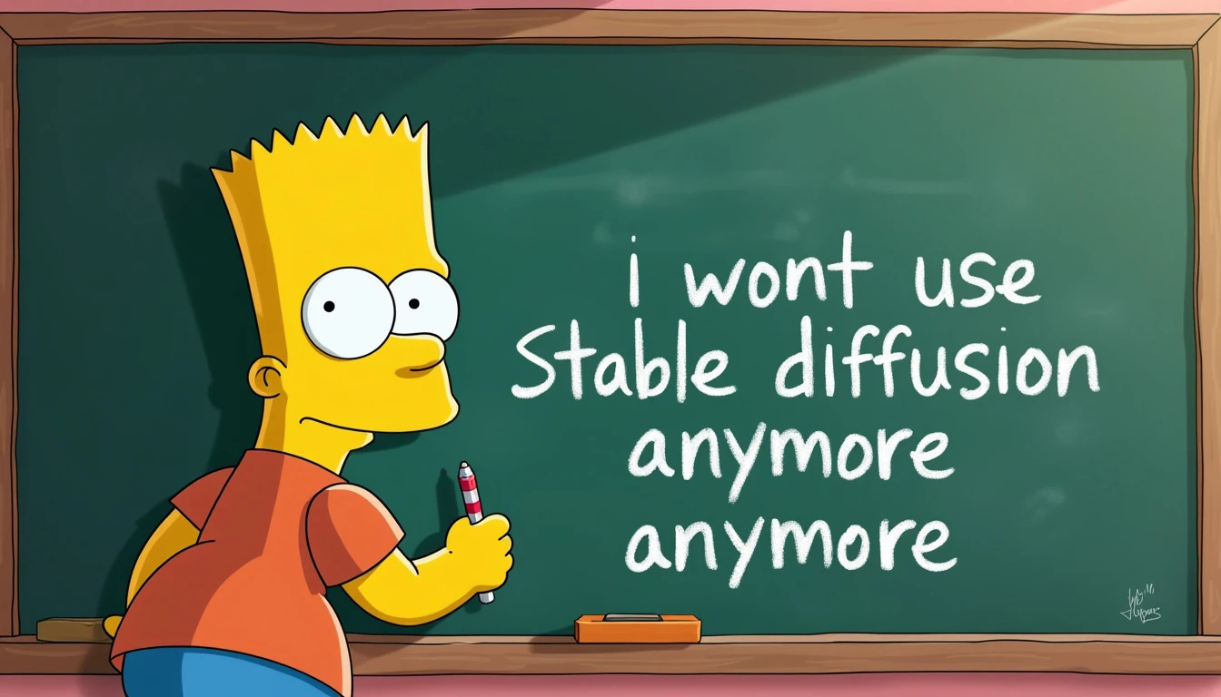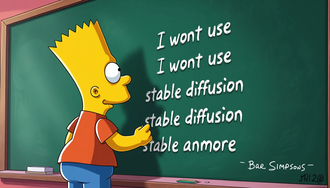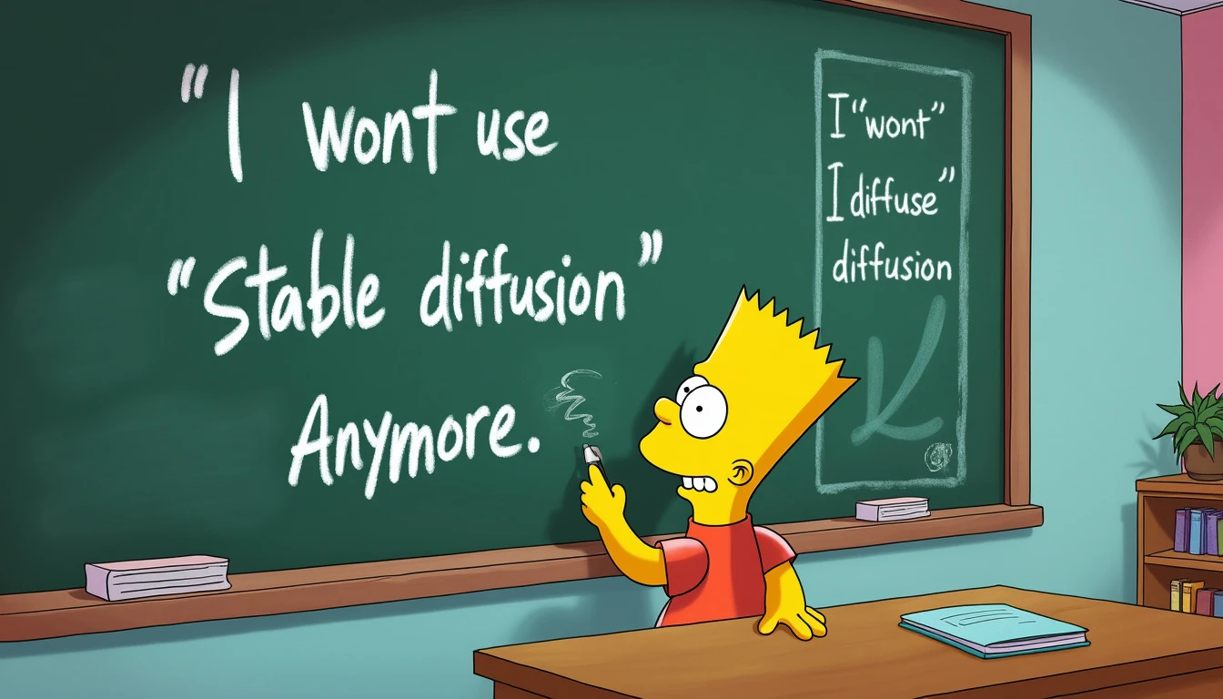 scene from The Simpsons, Bart Simpson writing on the school chalkboard "I WONT USE STABLE DIFFUSION ANYMORE" repeatedly.
