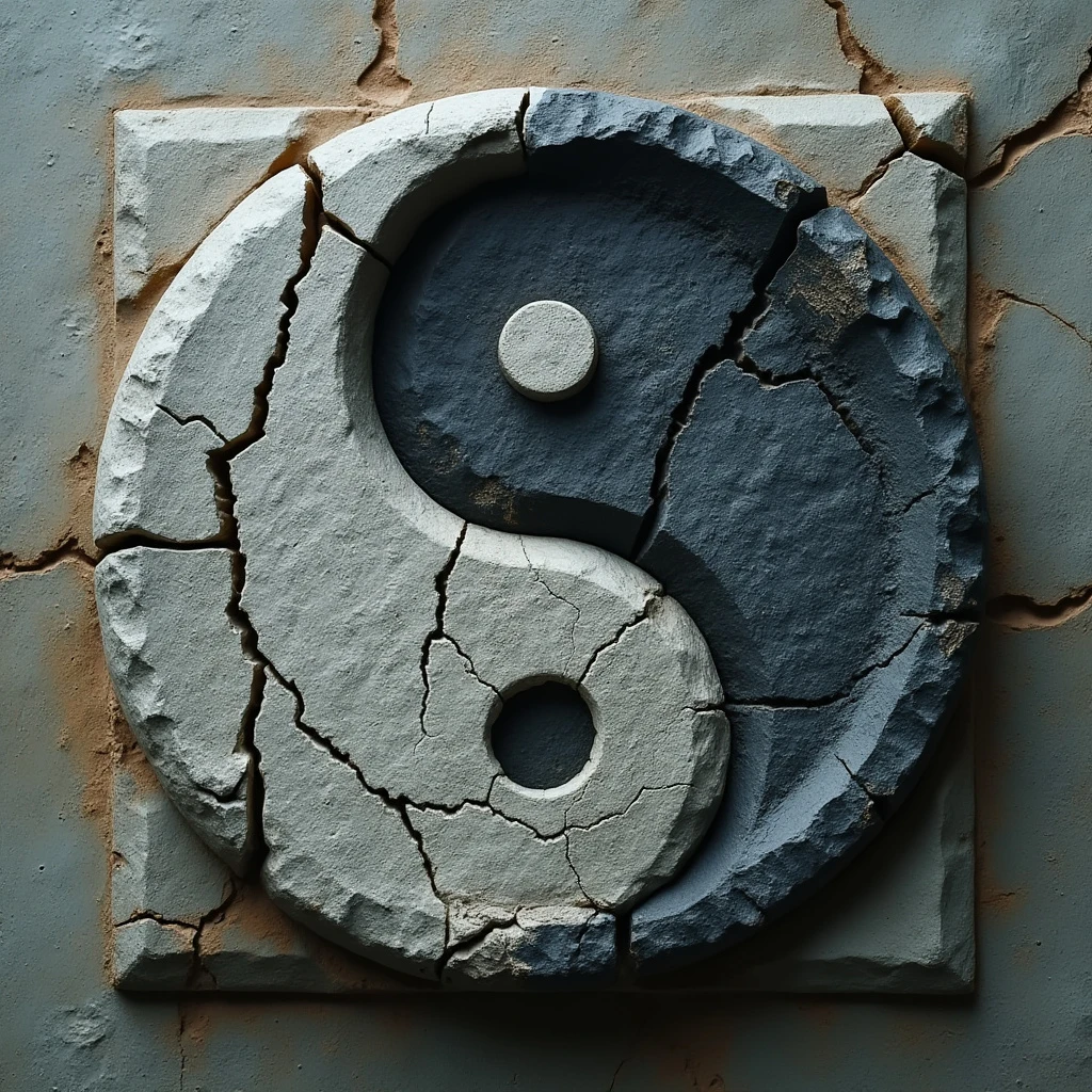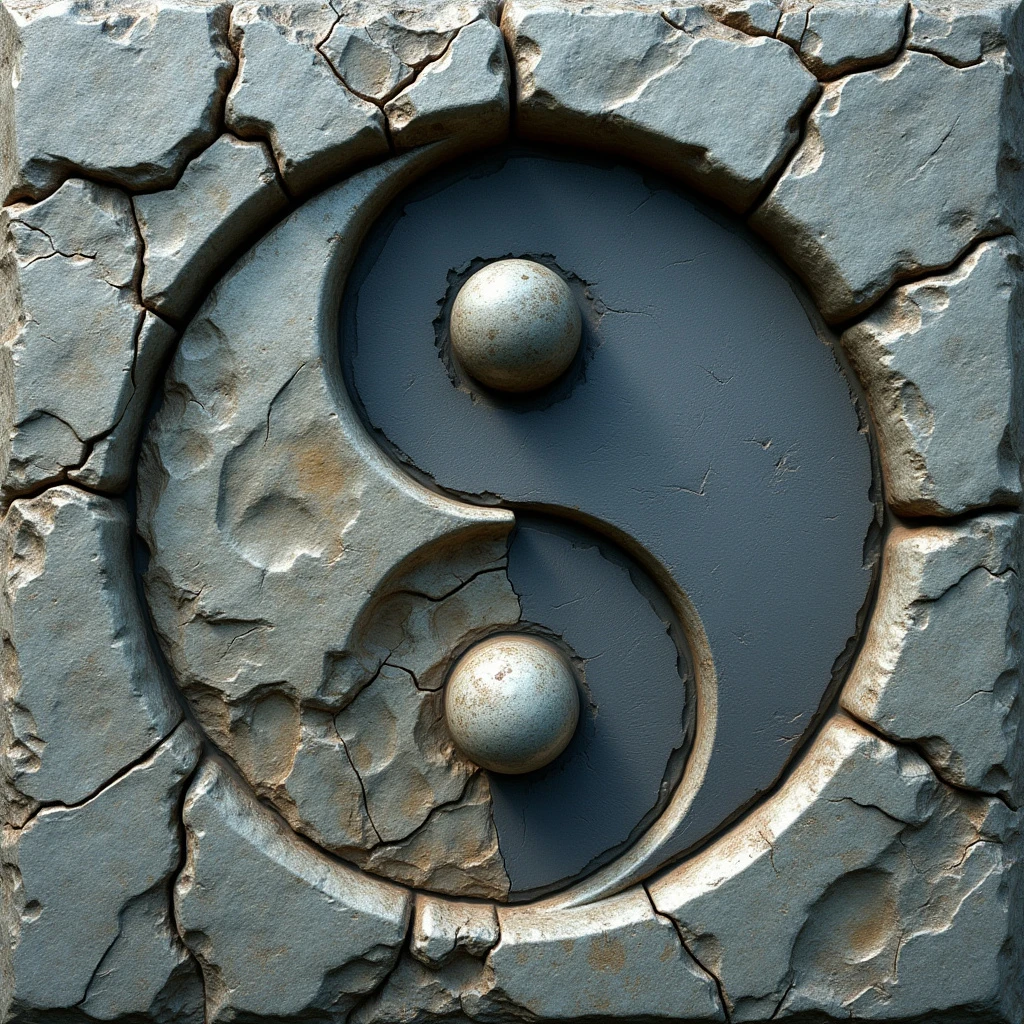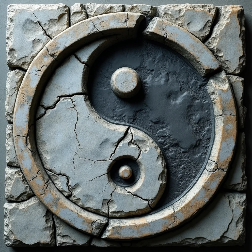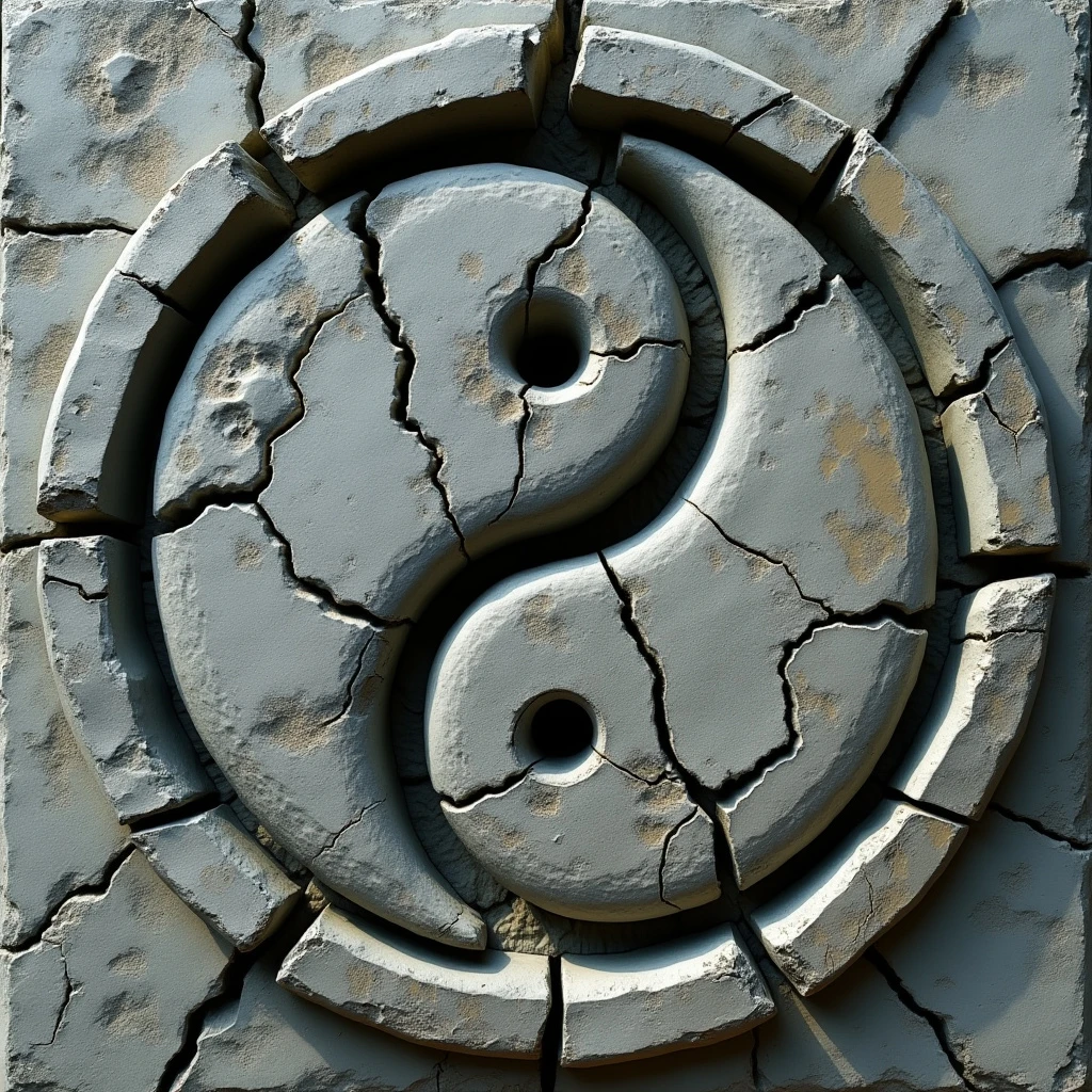 A highly detailed image of a stone yin-yang symbol that appears to be intricately carved into a heavy, resilient stone. The symbol is marked with deep, prominent cracks, and its surface is rough, showcasing signs of erosion and age. The carving is precise yet worn, giving it a sense of historical significance and an ancient aura. The yin-yang design is clearly visible despite the weathered look, with variations in stone color ranging from light gray to dark. The background is simple, enhancing the focus on the yin-yang and its enduring, mystical presence. The lighting casts subtle shadows, highlighting the depth and texture of the carved stone.