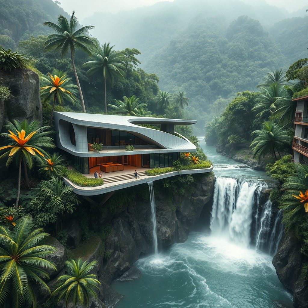 A futuristic concrete modern house on a waterfall inspired from a famous architect, with exotic luxuriant vegetation around, in a tropical jungle setting, photorealistic, a masterpiece, 4K, high details, view from above