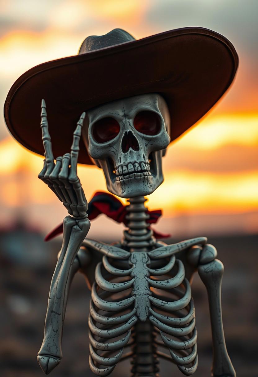 (By Larry Carlson:100), a skeleton in a cowboy hat holding up a sign, "nice posts btw" , (heavenly background details:1.45), dof, realistic details, heaven aesthetic, cirq du soleil, (style Jeremy Geddes:1.35), (Harsh lighting:1.4), cinematic, dramatic, raw, rating_safe