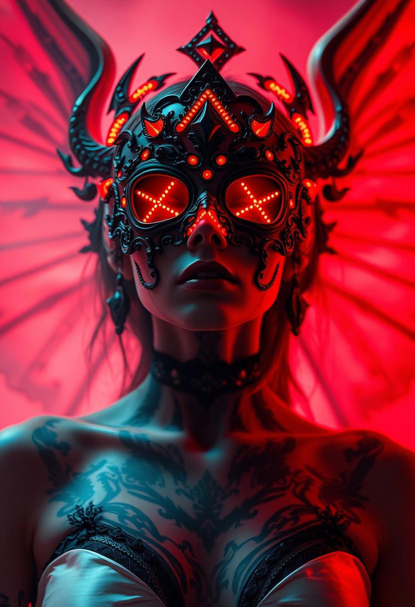 (By Larry Carlson:100), fallen angel, a scene from a masquerade of the depths, beautiful, hellraiser, haunting, femme, (grimdark neon details:1.45), (neon color esoteric glowing tattoos:1.5 on face and body), epic skin details, grimdark aesthetic, a quiet phantom, neo cultist attire, (style Jeremy Geddes:1.35), Satin texture, (Glitchy:1.5) (Foggy:1.35), (Harsh lighting:1.4), cinematic, dramatic, raw, goddess pose, extravagant embellishments, choreographed, expensive production, mask of the red death in neon, emotive, phantasm, euphoria, mania, delight, dancer in the red, rating_safe, close up
