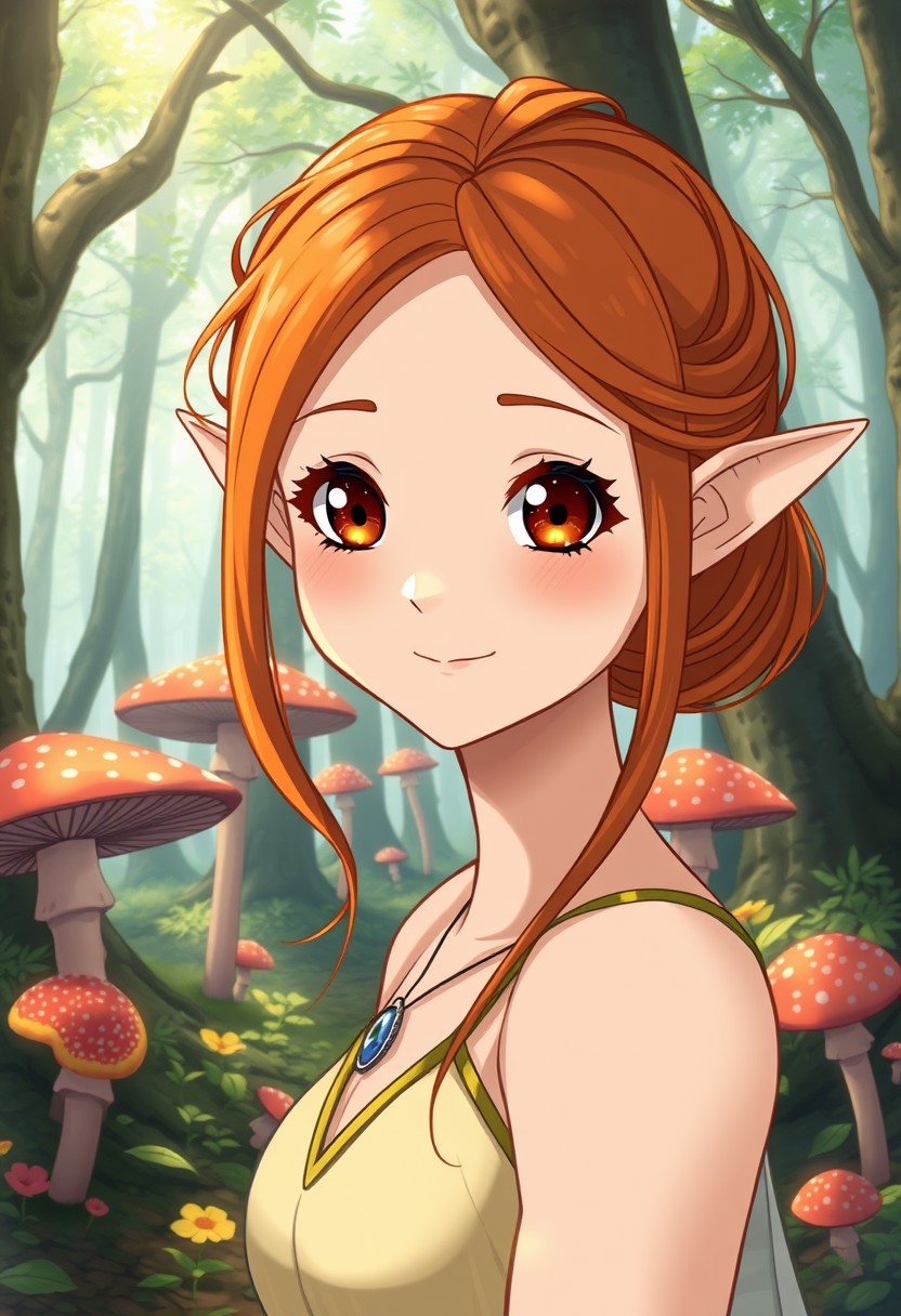 Prompt that will make Faeia laugh. detailed anime shading, elegant adult elf woman with and orange hair, detailed eyes, kawaii face, view from front, round face, perfect cute face, facing viewer, head tilted to the side, smile, upper body, closeup of face, standing, standing in magical forest of giant mushrooms,