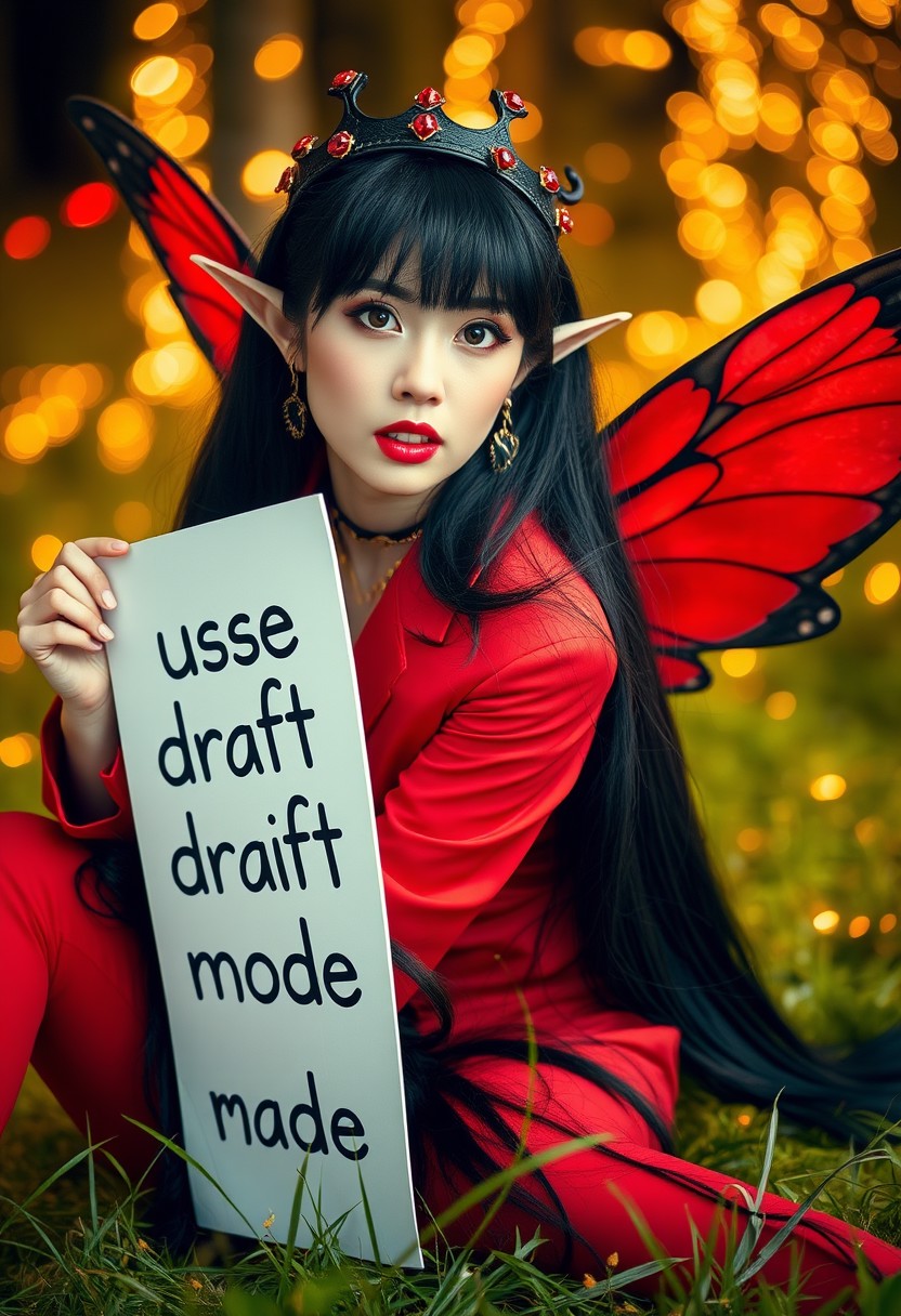Photography model, dynamic scene, dressed up as fairy girl, holding a sign that says " use draft mode" long black hair, sitting, hand on grass, very long hair, bangs (black crown with red stones on head: 1.5), head over shoulder, brown eyes, makeup, red lips, plump lips, big red butterfly wings on back, red suit, slim, sexy, seductive , sensitive face, surprised, raised eyebrows, erotic emotions, gold ear jewelry, gold neck jewelry, elf ears, yellow-green forest, night, firefly lights, many fireflies, many small red lights in the background (full body: 1 ,5)