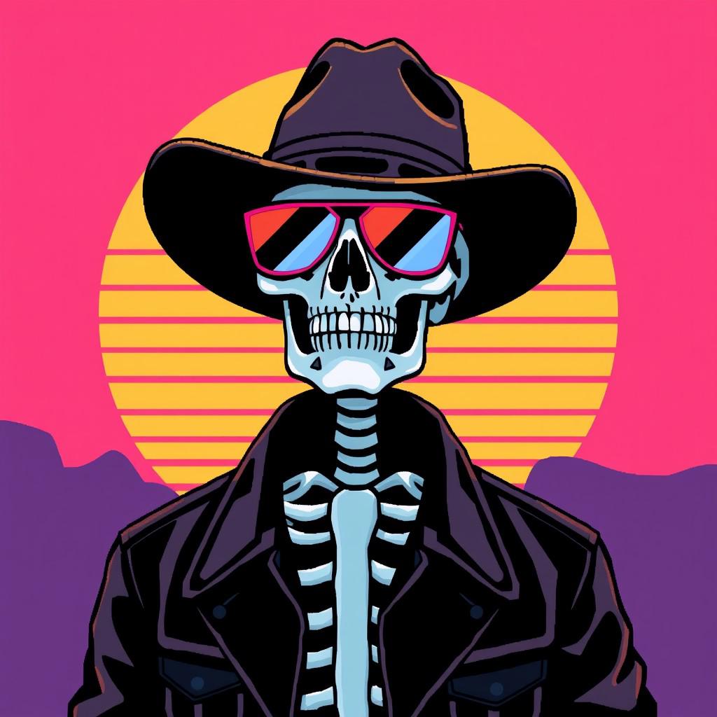 Retrowave minimalist skeleton, cowboy hat, jacket, sunglasses, outrun, pixel art, lofi vibes, profile avatar, icon, site icon,