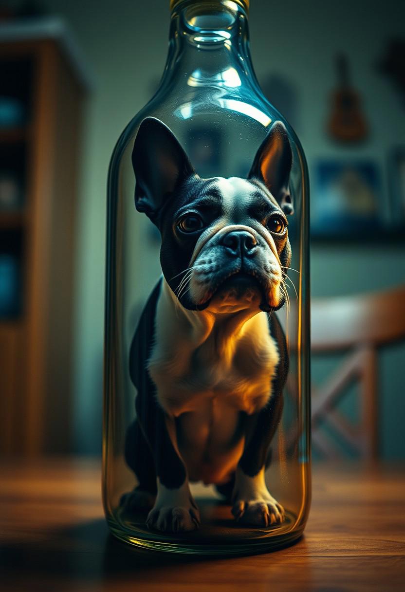 (By Larry Carlson:100), Boston terrier inside a bottle , (home background details:1.45), dof, realistic details, cozy aesthetic, (style Jeremy Geddes:1.35), (Harsh lighting:1.4), cinematic, dramatic, raw, rating_safe
