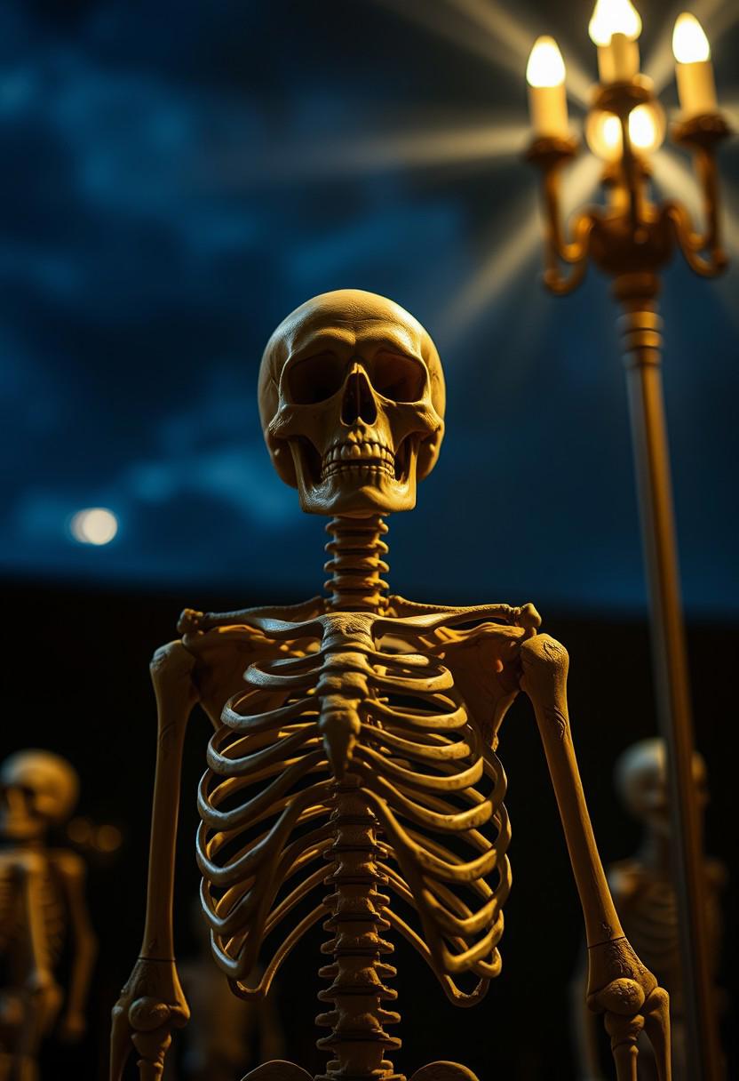 (By Larry Carlson:100), a skeletal scene from a divine comedy, (heavenly background details:1.45), dof, realistic details, heaven aesthetic, cirq du soleil, (style Jeremy Geddes:1.35), (Harsh lighting:1.4), cinematic, dramatic, raw, rating_safe