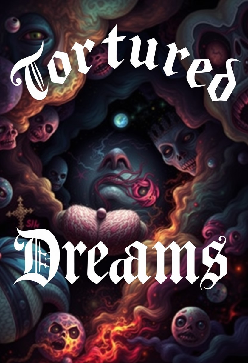 A vivid digital art piece depicting the dreams of a schizophrenic, written above the main focus of the image in fancy script lettering are the words "Tortured Dreams"