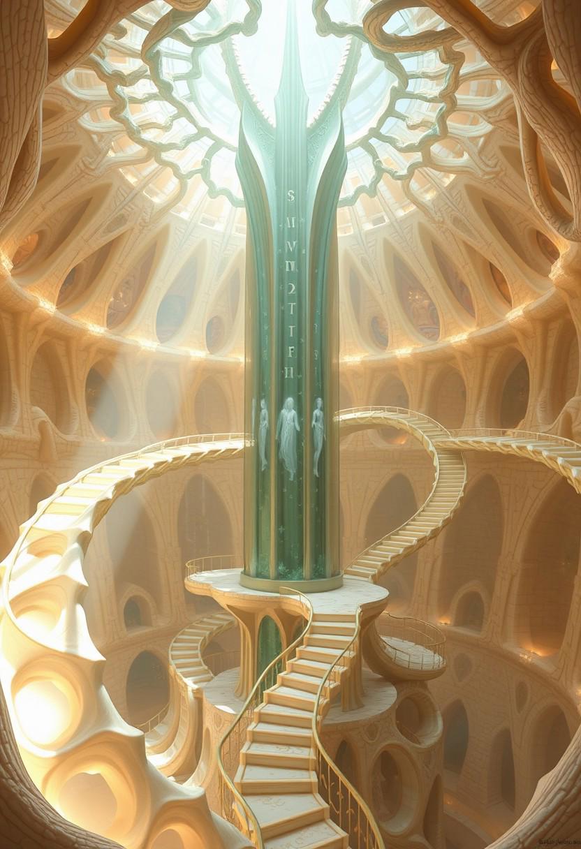 The Infinity Circuit Chamber is the spiritual heart of the Craftworld, where the souls of the Eldar dead reside within the wraithbone matrix. The chamber is an ethereal, otherworldly place, suffused with a soft, shimmering light that emanates from the wraithbone structures spiraling gracefully around the room. These organic, flowing forms twist and intertwine, creating a labyrinthine network that pulses with a gentle, living energy. The air is filled with a serene hum, a constant, soothing resonance that seems to vibrate through every fiber of the chamber, echoing the eternal connection between the Eldar and their ancestors. At the center of the chamber stands a grand, living sculpture—a vast, towering pillar of wraithbone, intricately carved with the glyphs and runes of the Eldar language. Within its translucent structure, one can see the faint, ghostly forms of spirits moving gracefully, their presence a constant reminder of the Craftworld’s heritage and the souls that guide it. Delicate bridges and walkways crafted from the same wraithbone arch across the chamber, connecting various points of the Infinity Circuit, allowing the Seers and Farseers to commune with the spirits. The walls are adorned with tapestries depicting the ancient history of the Eldar, their vibrant colors muted and softened by the ambient glow. The atmosphere here is one of solemn reverence and quiet introspection, as the living Eldar seek the wisdom of those who have gone before.